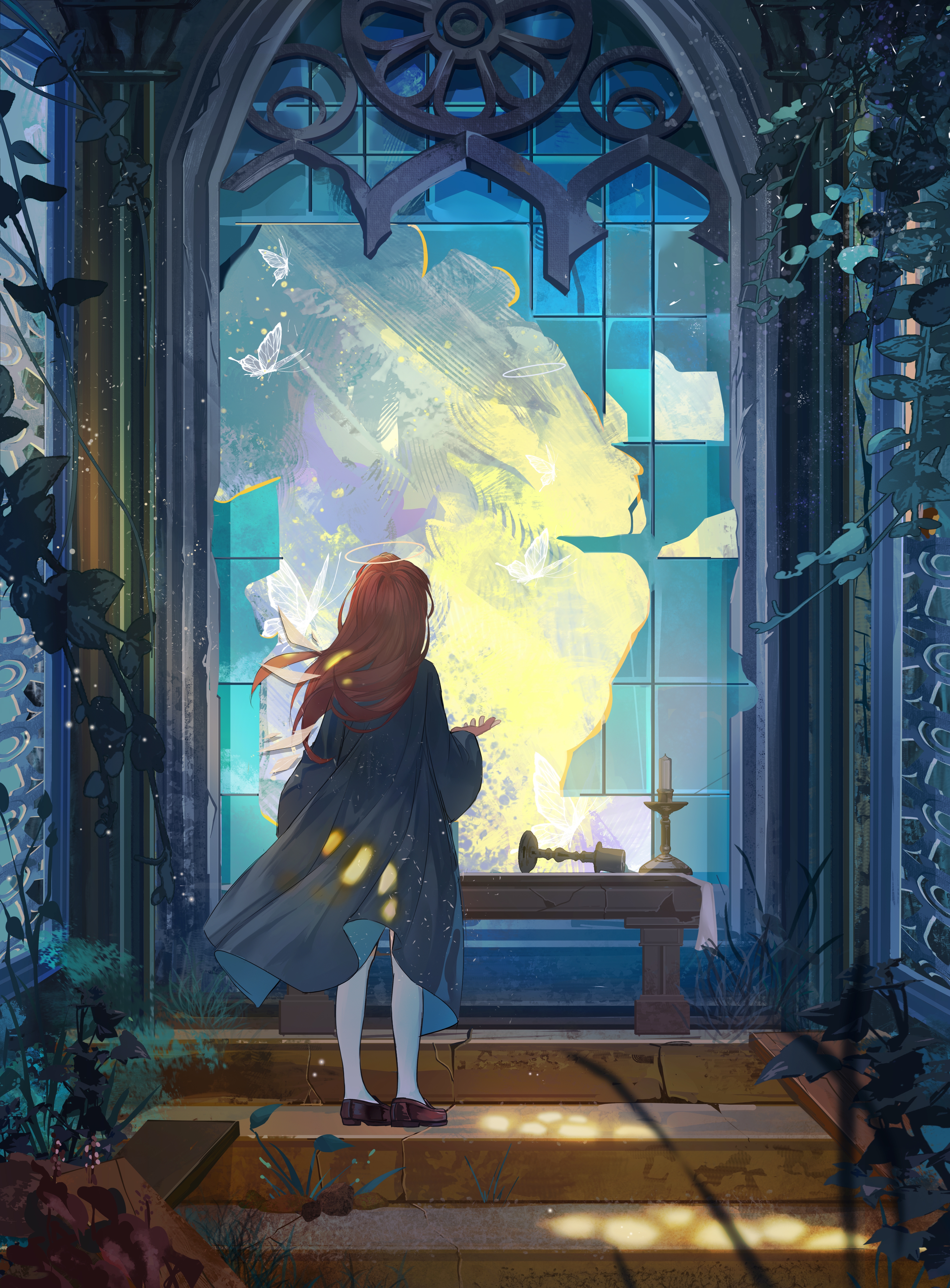 1girl absurdres alternate_costume arknights black_coat broken_window brown_shoes bug butterfly candle candlestand chinese_commentary coat commentary_request detached_wings exusiai_(arknights) halo highres indoors insect ivy kneehighs long_hair looking_outside red_hair shisangeashi shoes socks solo stained_glass stairs standing table white_socks wide_shot window wings