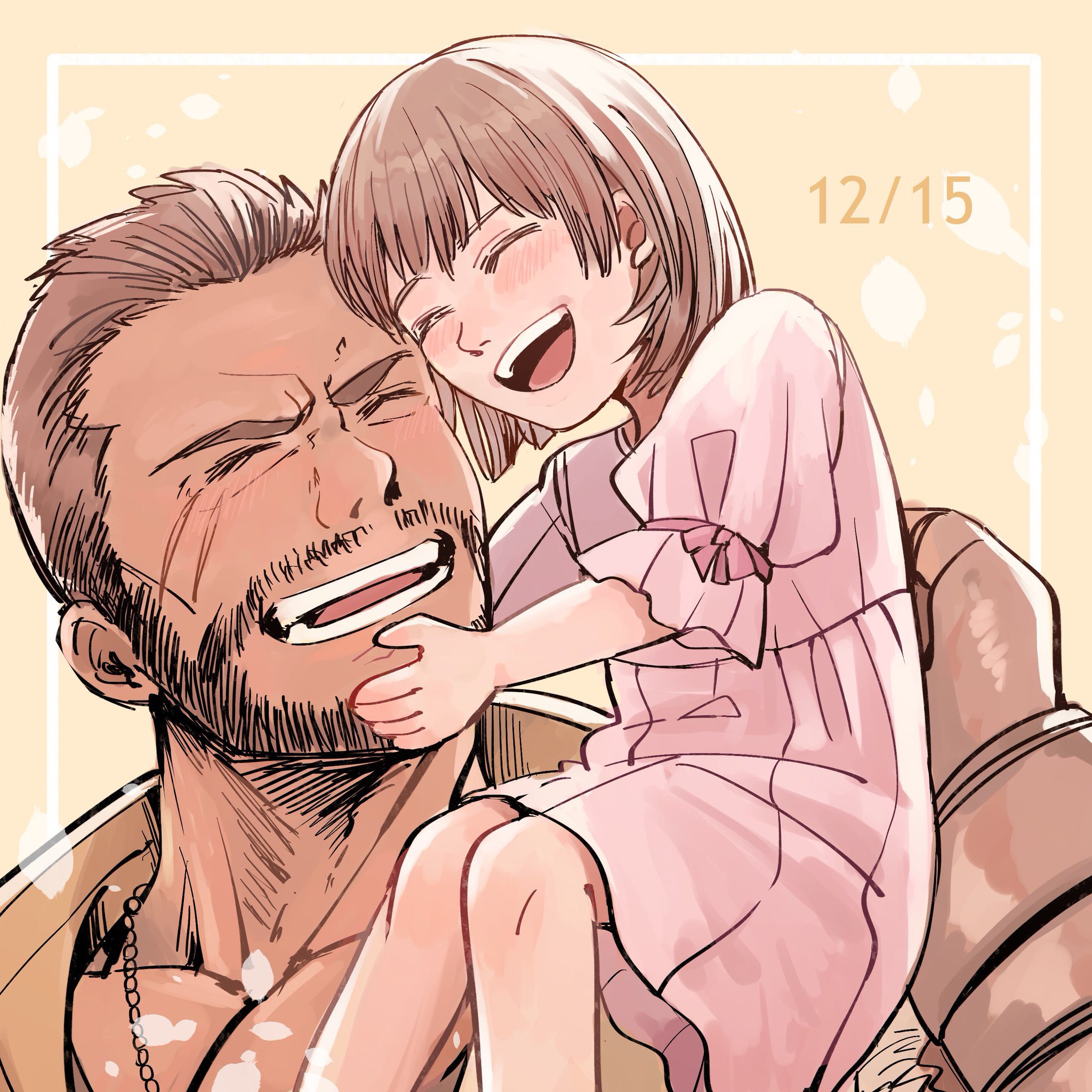 1boy 1girl barret_wallace beard blush border brown_hair closed_eyes dark-skinned_male dark_skin dated dress facial_hair facial_scar father_and_child father_and_daughter final_fantasy final_fantasy_vii final_fantasy_vii_remake hand_on_another's_chin happy_birthday highres lower_teeth_only marlene_wallace nnnmmg0725 open_mouth parent_and_child pink_dress puffy_short_sleeves puffy_sleeves scar scar_on_cheek scar_on_face short_hair short_sleeves sitting_on_shoulder smile teeth upper_body upper_teeth_only very_short_hair yellow_background