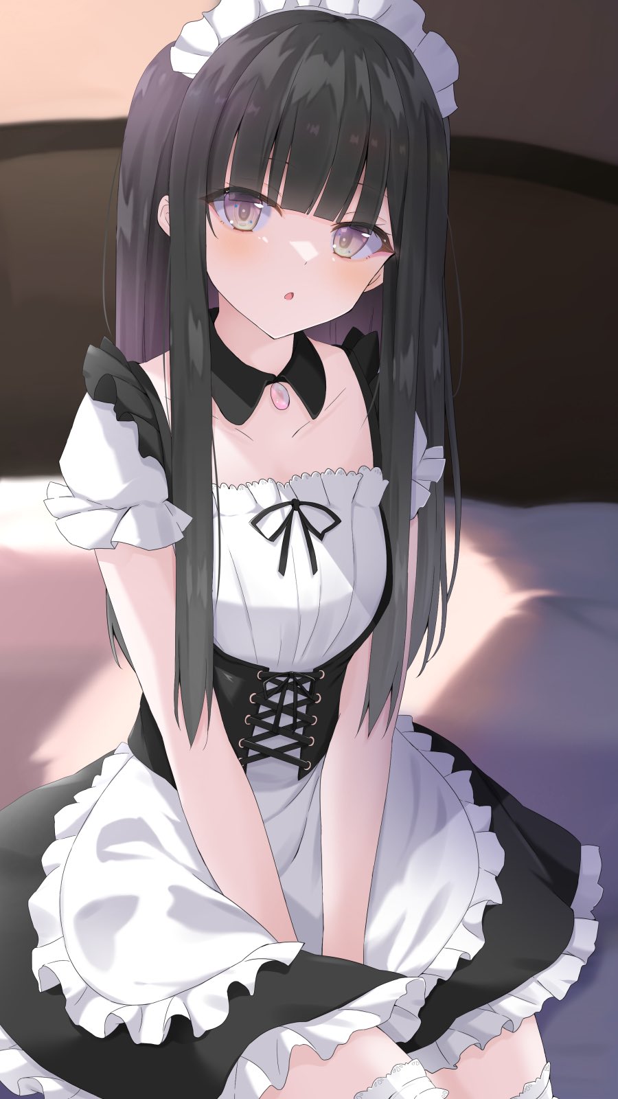 1girl apron bed black_corset black_ribbon breasts brooch collar corset detached_collar dress frilled_dress frilled_sleeves frilled_straps frills gem grey_eyes hair_ornament hands_on_lap head_tilt highres hime_cut indie_utaite indie_virtual_youtuber jewelry kurono_yuzuko looking_at_viewer maid maid_headdress mikeneko_(vtuber) niconico open_mouth ribbon short_sleeves sidelocks sitting small_breasts tareme virtual_youtuber