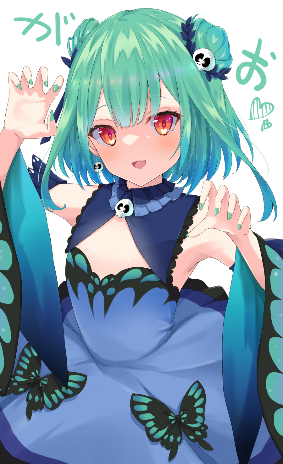 1girl animal_print blue_bow blue_bowtie blue_dress blue_hair blue_ribbon bow bowtie brooch bug butterfly butterfly_ornament butterfly_print collar detached_collar detached_sleeves double_bun dress earrings fang flat_chest frilled_collar frilled_dress frills gradient_hair green_hair hair_bun hair_ornament hair_ribbon hands_up heart highres hololive insect jewelry kurono_yuzuko looking_at_viewer medium_hair multicolored_hair nail_polish red_eyes ribbon sidelocks skin_fang skull_brooch skull_earrings skull_hair_ornament tareme translation_request uruha_rushia uruha_rushia_(1st_costume) virtual_youtuber wide_sleeves