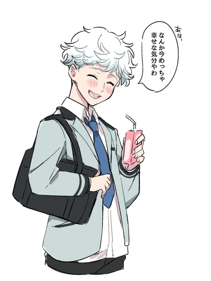 1boy blazer blue_necktie closed_eyes drink_carton grin holding jacket juice_box male_focus necktie open_clothes open_jacket smile speech_bubble tokimeki_memorial tokimeki_memorial_girl's_side tokimeki_memorial_girl's_side_1st_love tokimeki_memorial_girl's_side_4th_heart yukijiro