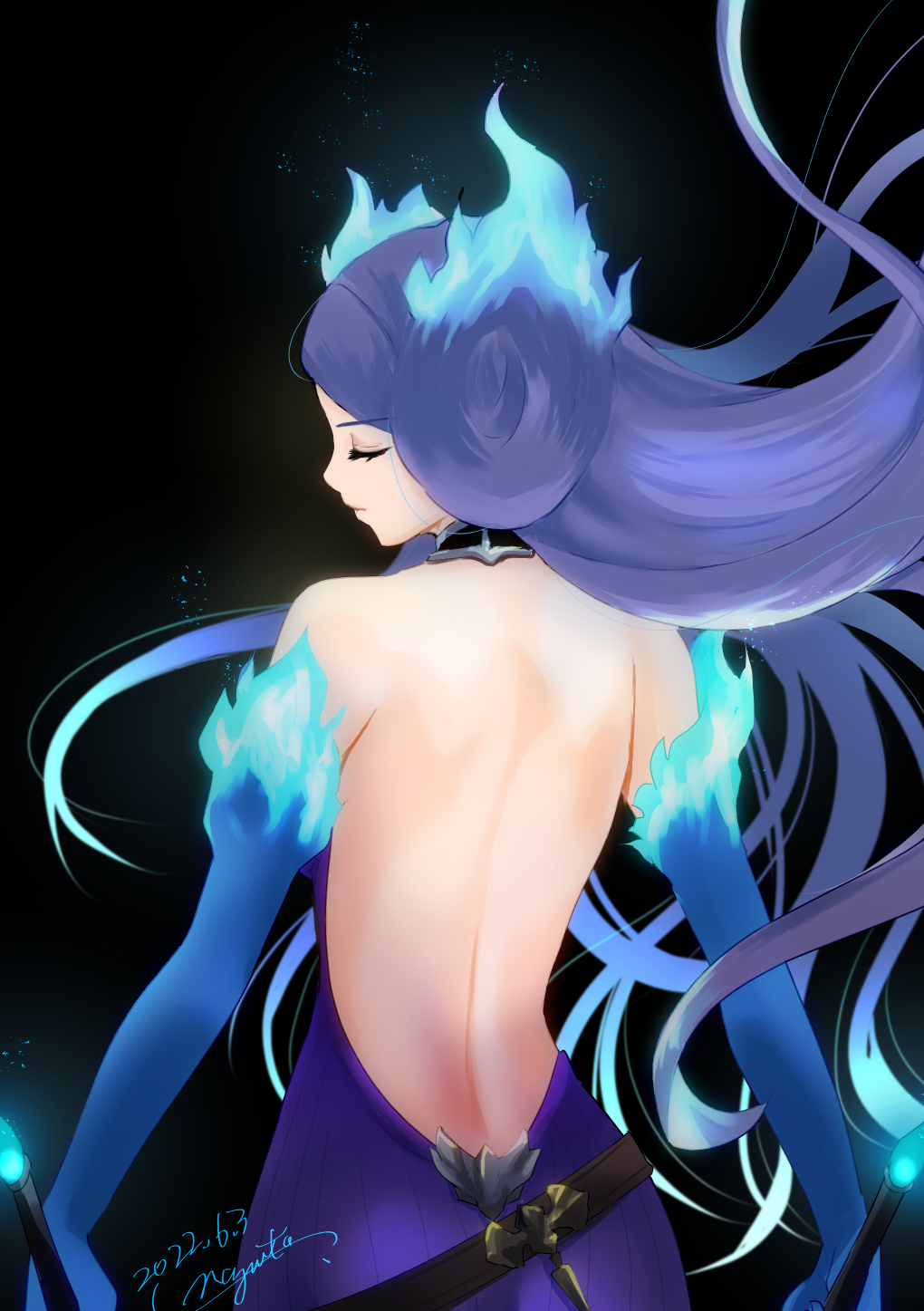 1girl 2022 artist_name back backless_dress backless_outfit bare_shoulders blue_dress blue_gloves brighid_(xenoblade) closed_eyes closed_mouth dated dress dual_wielding elbow_gloves gloves highres holding holding_sword holding_weapon long_hair nayuta-kanata signature solo sword weapon xenoblade_chronicles_(series) xenoblade_chronicles_2