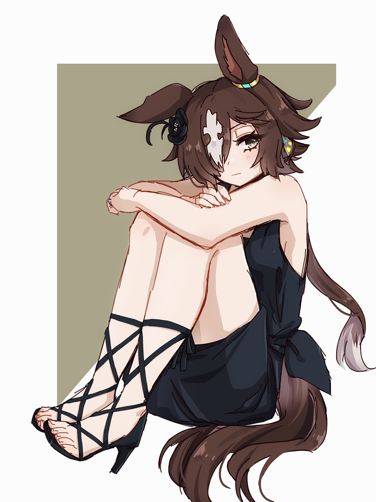1girl animal_ears bare_shoulders black_dress black_footwear brown_background brown_eyes brown_hair closed_mouth dress formal_clothes full_body hair_ornament hide_oo high_heel_sandals high_heels highres horse_ears horse_girl horse_tail hugging_own_legs long_hair looking_at_viewer ponytail sandals sleeveless sleeveless_dress tail toes two-tone_background umamusume vodka_(umamusume) white_background