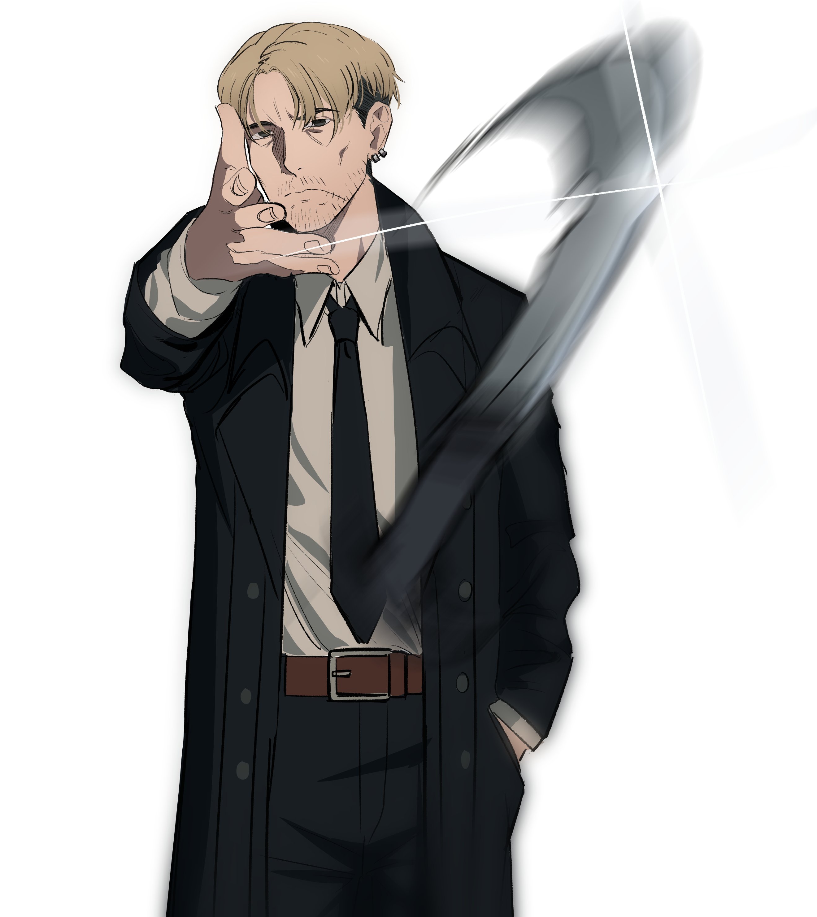 1boy absurdres belt black_coat black_jacket black_necktie black_pants blonde_hair chainsaw_man coat collared_shirt ear_piercing woe_plague_be_upon_ye_(meme) facial_hair formal_clothes glint hand_in_pocket highres jacket kishibe_(chainsaw_man) knife looking_at_viewer meme motion_blur necktie pants piercing shirt shirt_tucked_in short_hair simple_background solo stitched_mouth stitches stubble suit throwing_knife undercut void_dot_exe weapon white_background white_shirt