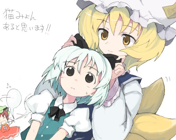 3girls ^_^ afterimage animal_ears aqua_vest bad_drawr_id bad_id black_bow black_bowtie black_eyes blonde_hair bow bowtie cat_ears chen chibi closed_eyes closed_mouth dutch_angle extra_ears fake_animal_ears flying_sweatdrops fox_tail frown hair_between_eyes hairdressing hands_up hat japanese_clothes konpaku_youmu konpaku_youmu_(ghost) long_sleeves looking_at_another looking_down motion_lines multiple_girls multiple_tails no_nose oekaki open_mouth pera puffy_long_sleeves puffy_short_sleeves puffy_sleeves short_hair short_sleeves simple_background smile split_mouth sweat tail tail_wagging tareme touhou translation_request upper_body vest white_background white_hair white_headwear wing_collar yakumo_ran yellow_eyes yellow_tail