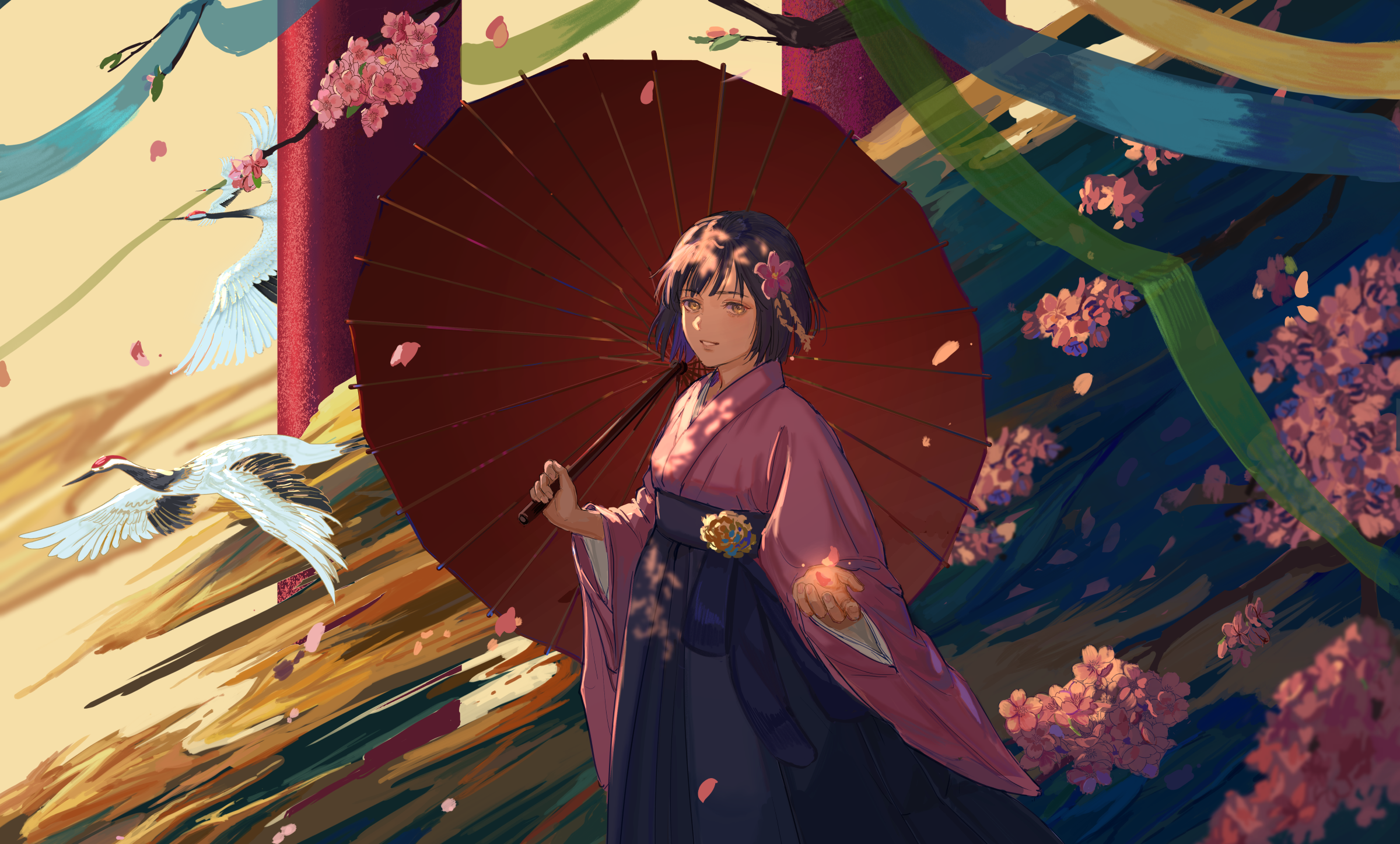 1girl animal axis_powers_hetalia bird black_hair bob_cut branch catching cherry_blossoms cowboy_shot crane_(animal) dappled_sunlight floral_print flower genderswap genderswap_(mtf) hair_flower hair_ornament hakama hakama_skirt highres holding holding_umbrella japan_(female)_(hetalia) japan_(hetalia) japanese_clothes long_sleeves looking_at_viewer looking_to_the_side oil-paper_umbrella parted_lips petals pillar pink_flower purple_hair ribbon short_hair skirt solo standing sunlight umbrella visible_air wide_sleeves wind yellow_eyes yellow_flower zhongerweiyuan