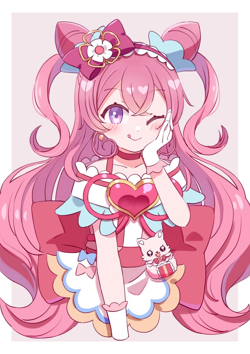 1girl ;q apron blush bow brooch choker commentary cone_hair_bun cure_precious delicious_party_precure earrings gloves hair_bow hair_bun hand_on_own_cheek hand_on_own_face heart heart_brooch highres huge_bow jewelry kome-kome long_hair magical_girl nagomi_yui one_eye_closed pink_choker pink_hair precure purple_eyes smile solo tongue tongue_out white_gloves yairon0315