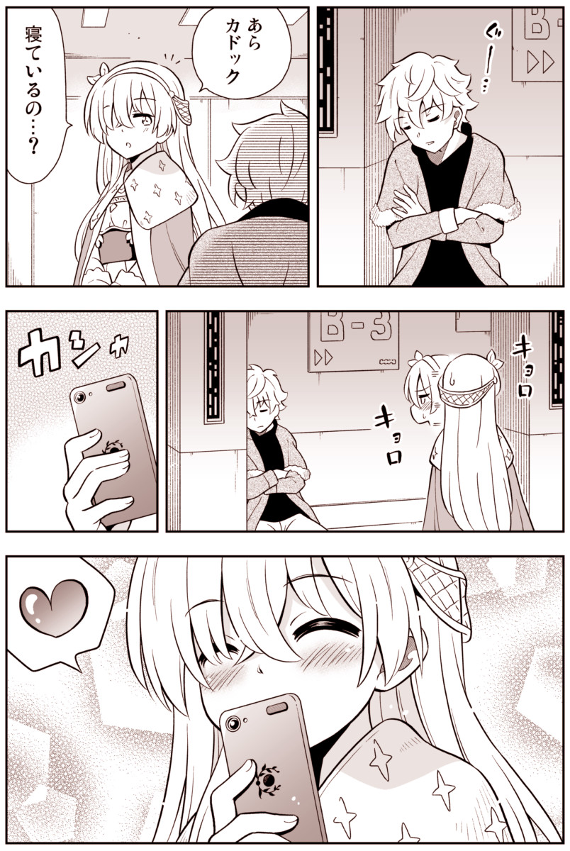 1boy 1girl amasawa_natsuhisa anastasia_(fate) cellphone closed_eyes comic fate/grand_order fate_(series) greyscale heart highres holding holding_phone kadoc_zemlupus long_hair monochrome phone sitting sleeping smartphone speech_bubble spoken_heart taking_picture translation_request