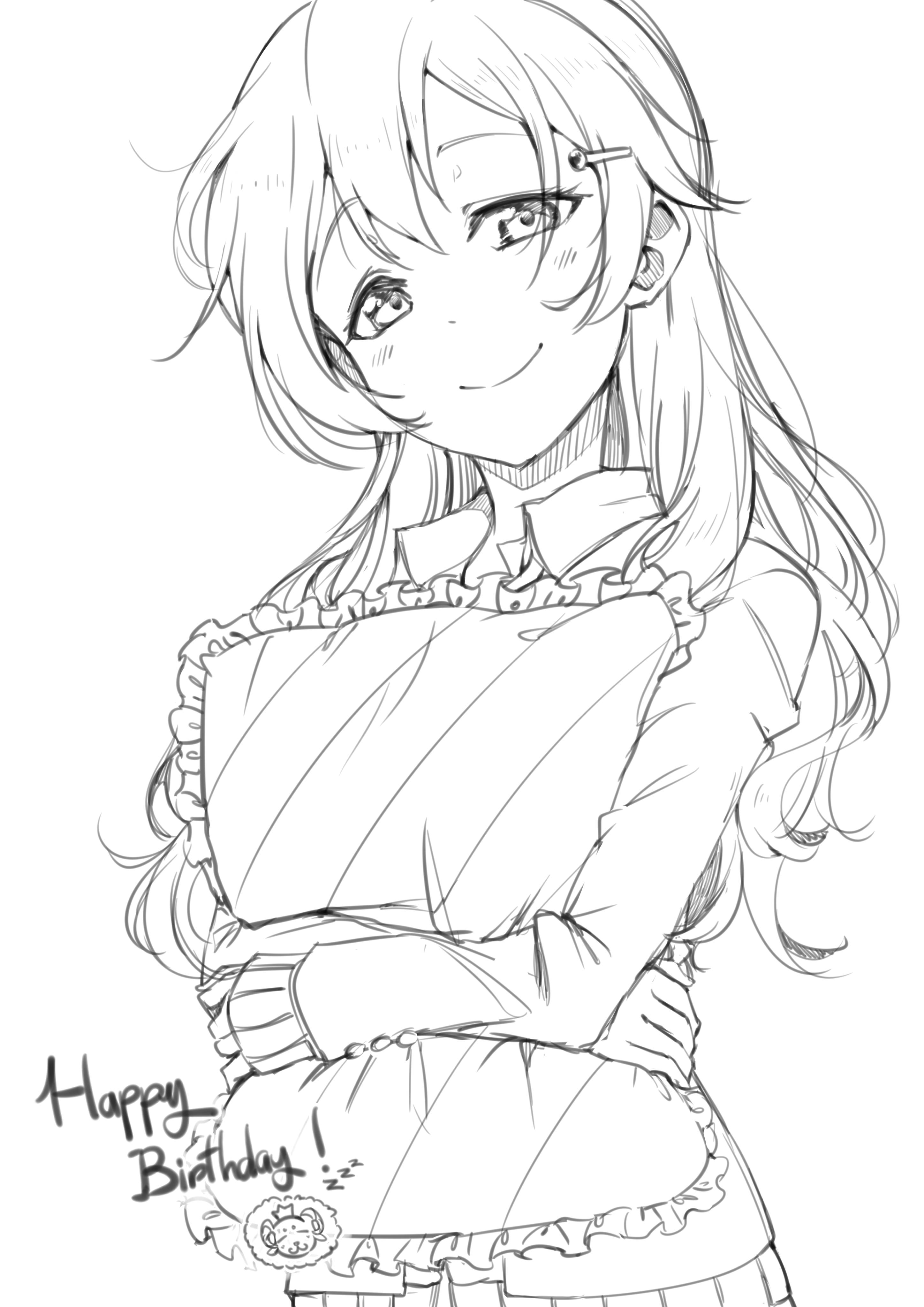 1girl absurdres bakaryuu birthday blush commentary english_text hair_ornament happy_birthday highres hugging_object konoe_kanata long_hair looking_at_viewer love_live! love_live!_nijigasaki_high_school_idol_club monochrome pillow pillow_hug sidelocks smile solo upper_body wavy_hair white_background