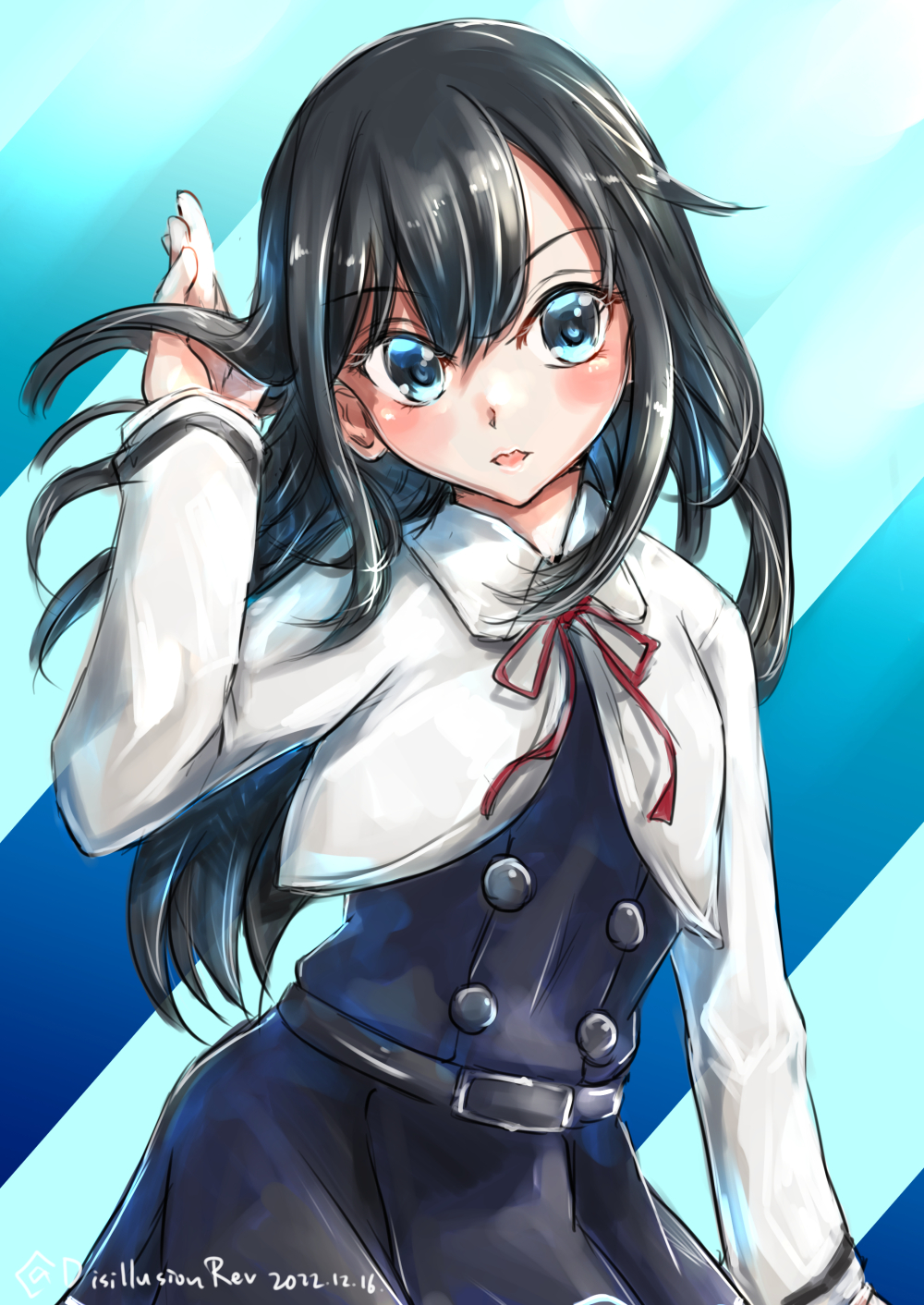 1girl artist_name asashio_(kancolle) asashio_kai_ni_(kancolle) belt black_hair blue_background blue_eyes buttons dated dress hair_between_eyes highres jacket kamio_(d-rev) kantai_collection long_hair long_sleeves one-hour_drawing_challenge pinafore_dress pleated_dress red_ribbon ribbon shirt sleeveless sleeveless_dress solo white_shirt