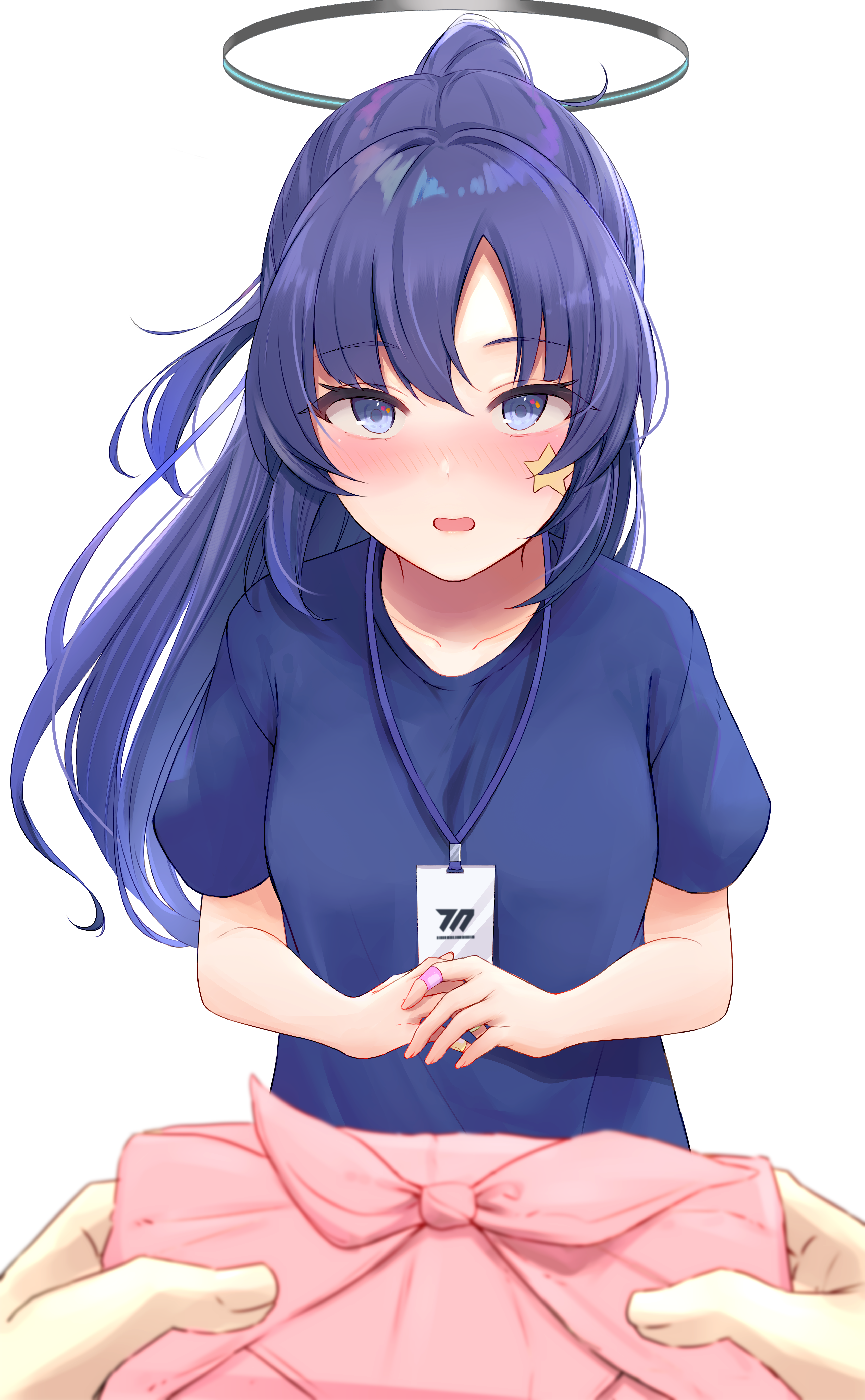 1girl absurdres bandaged_fingers bandages blue_archive blue_shirt blush halo highres holding id_card lanyard long_hair looking_at_viewer own_hands_together parted_lips ponytail pov purple_eyes purple_hair shirt short_sleeves simple_background solo_focus star_(symbol) sticker sticker_on_face upper_body white_background wrapped_bento yata_mawari yuuka_(blue_archive) yuuka_(track)_(blue_archive)