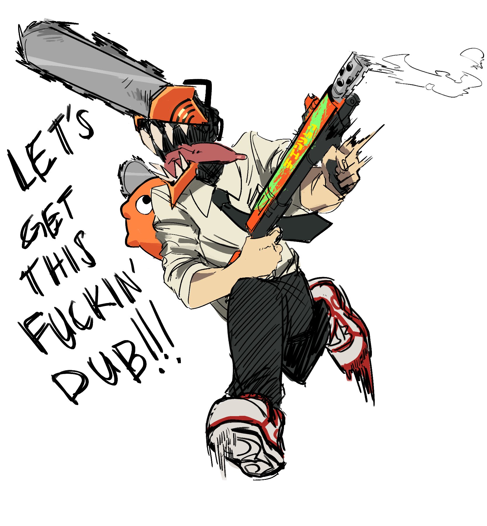 1boy assault_rifle black_necktie black_pants chainsaw chainsaw_man collared_shirt fortnite gun highres holding holding_gun holding_weapon hybrid male_focus necktie open_mouth pants pochita_(chainsaw_man) rifle sharp_teeth shirt simple_background sleeves_rolled_up smoke solo_focus teeth tongue tongue_out void_dot_exe walking weapon white_background white_shirt