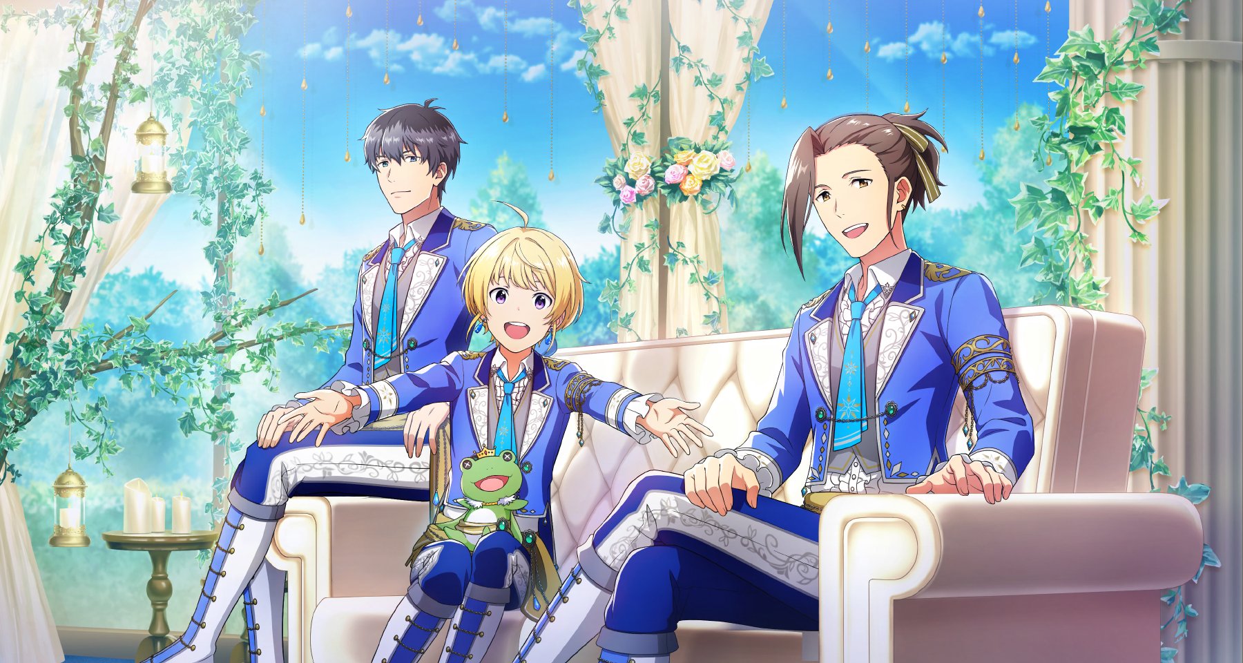 ahoge beit_(idolmaster) blonde_hair blue_sky boots brown_eyes candle collared_shirt couch crown earrings fingernails formal_clothes hair_between_eyes highres idolmaster idolmaster_side-m idolmaster_side-m_growing_stars jewelry kaerre long_sleeves mini_crown necktie official_art pierre_bichelberger plant purple_eyes shirt sitting sky smile stuffed_animal stuffed_frog stuffed_toy suit takajo_kyoji teeth third-party_source upper_teeth_only vines watanabe_minori