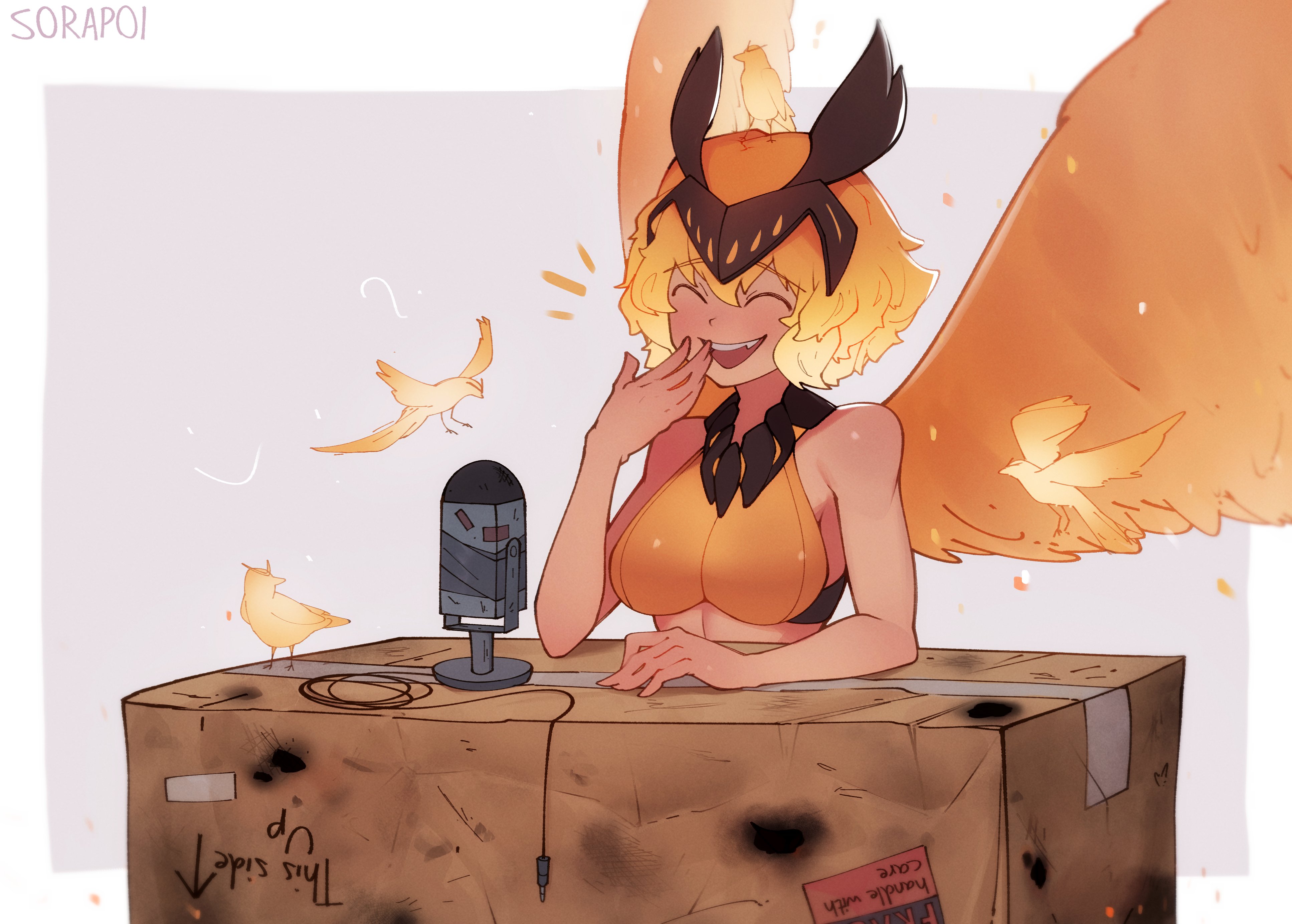 1girl :d absurdres artist_name bare_shoulders bird border box breasts closed_eyes crop_top dota_(series) dota_2 highres laughing medium_breasts microphone open_mouth orange_hair orange_shirt orange_wings phoenix_(dota) purple_background shirt short_hair simple_background smile solo sorapoi white_border wings