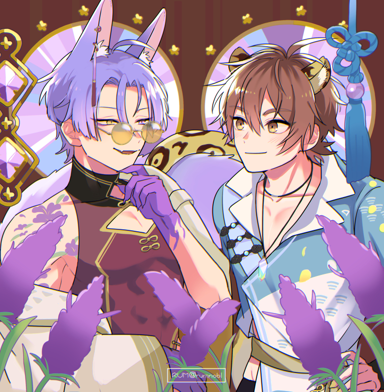 2boys animal_ears brown_eyes brown_hair eiden_(mystical_banquet)_(nu_carnival) eiden_(nu_carnival) fingernails flower flower_tattoo fox_boy gem heterochromia jewelry kuya_(kitsune_dream)_(nu_carnival) kuya_(nu_carnival) lavender_(flower) leopard_ears leopard_tail looking_at_another male_focus multiple_boys necklace nu_carnival purple_eyes purple_hair round_eyewear ryouma_(888) sharp_fingernails smile tail tattoo yellow_eyes