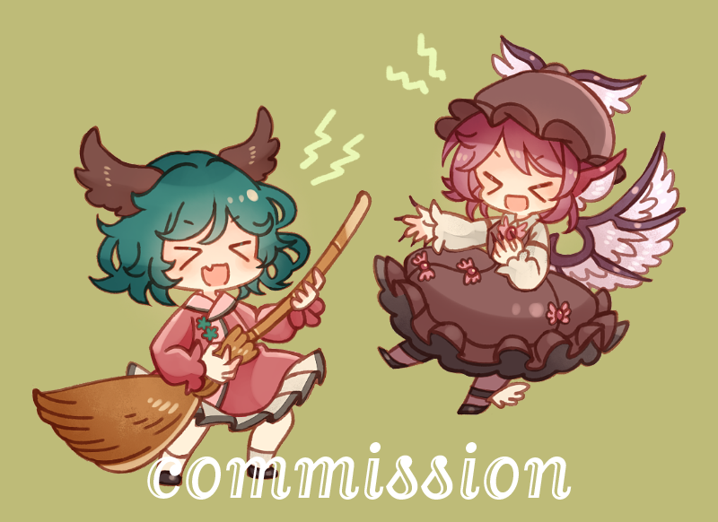 >_< 2girls animal_ears bird_ears bird_wings black_footwear broom brown_dress brown_headwear brown_nails brown_socks commission dog_ears dress fang fingernails frilled_dress frills full_body green_background green_hair hat holding holding_broom kasodani_kyouko kneehighs long_fingernails long_sleeves multiple_girls mystia_lorelei nail_polish open_mouth pink_dress pink_hair sharp_fingernails shoes short_hair simple_background skeb_commission skin_fang smile socks touhou virginia_complex white_socks white_wings winged_footwear winged_hat wings