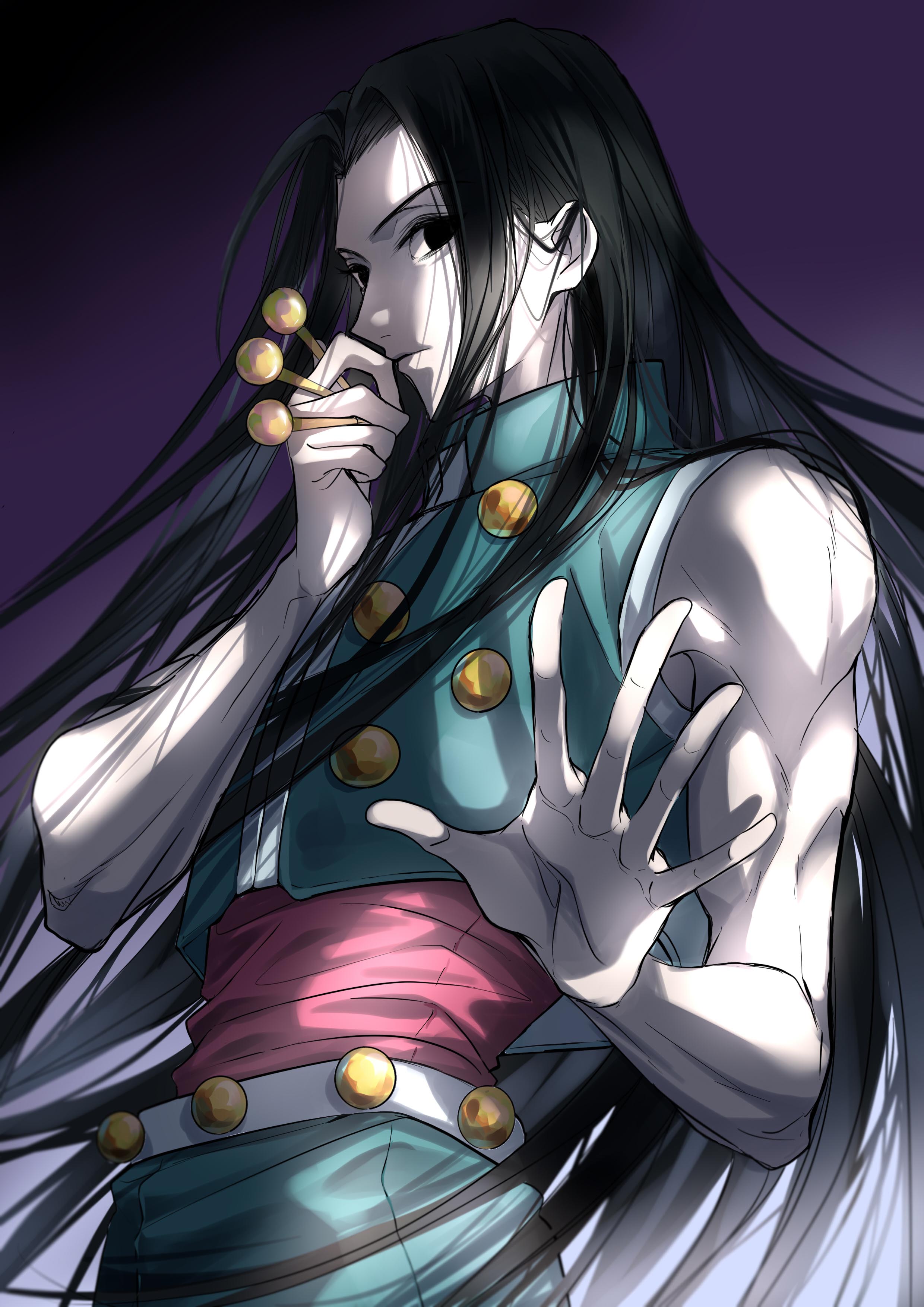 1boy absurdres black_eyes black_hair highres hunter_x_hunter illumi_zoldyck long_hair looking_at_viewer male_focus pin riceko33 simple_background solo