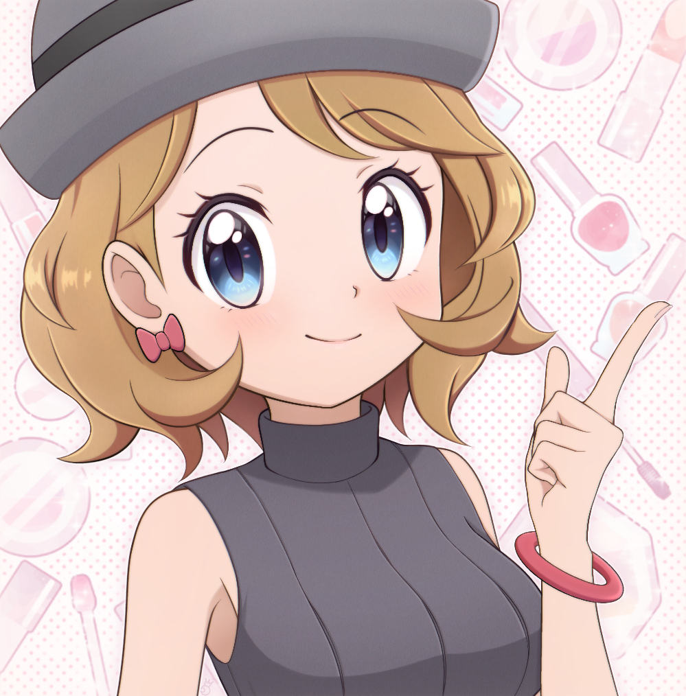 1girl blonde_hair blue_eyes bracelet breasts closed_mouth commentary_request earrings eyelashes grey_hat hand_up hat index_finger_raised jewelry kouzuki_(reshika213) looking_at_viewer medium_breasts medium_hair nintendo pokemon pokemon_(anime) pokemon_journeys pokemon_swsh105 serena_(pokemon) smile solo sweater_vest upper_body