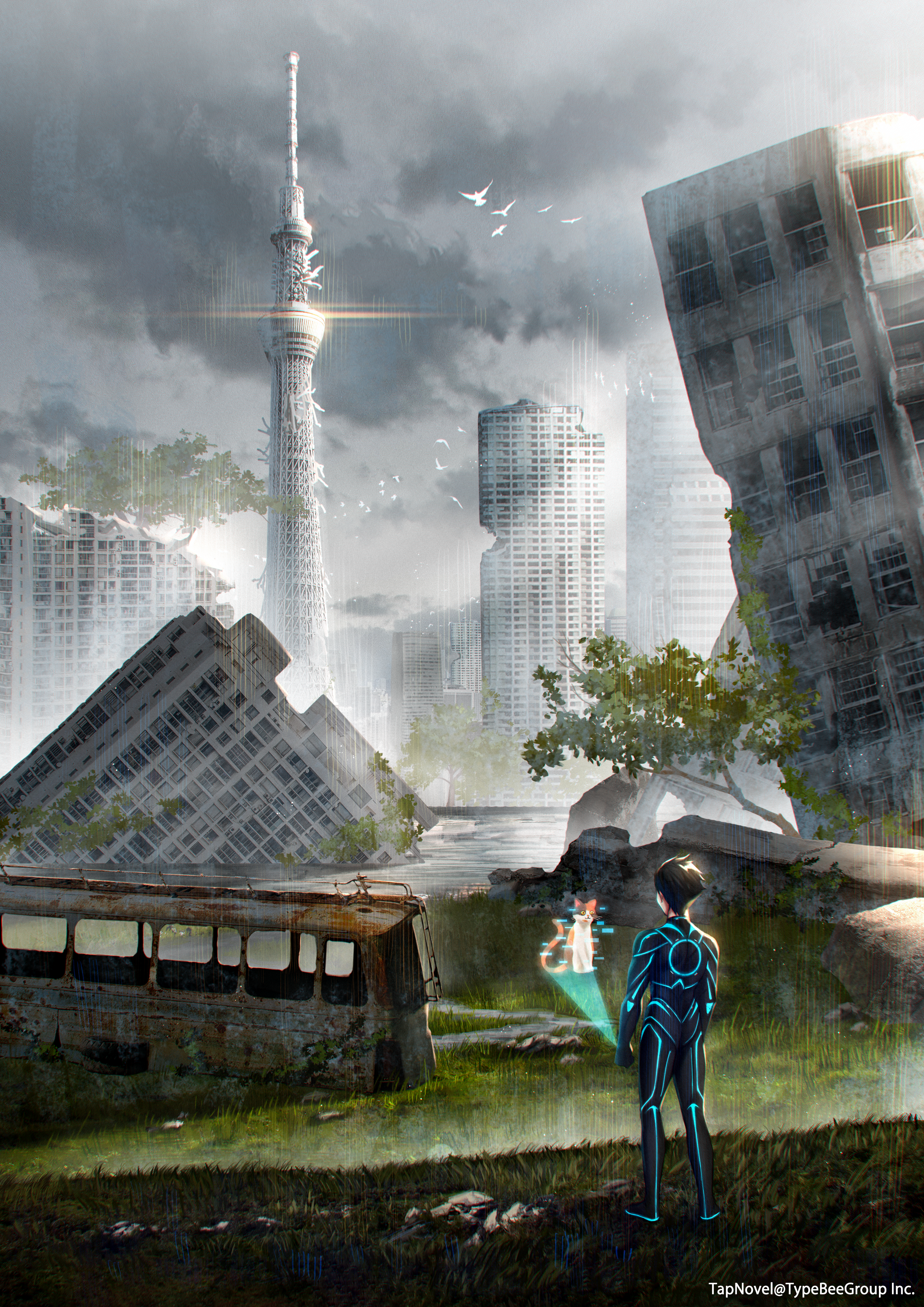 1boy absurdres animal bird black_bodysuit bodysuit building bus cat cloud cloudy_sky commentary_request copyright_request from_behind glowing grass highres hologram hoshimiya_aki male_focus motor_vehicle official_art outdoors overgrown rain ruins sky solo standing tower tree water wreckage