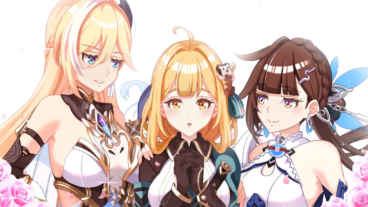 3girls :d ahoge armor armored_dress bare_shoulders black_gloves black_shirt blonde_hair blue_eyes brown_eyes brown_hair china_dress chinese_clothes collared_shirt dress durandal_(honkai_impact) durandal_(palatinus_equinox)_(honkai_impact) earrings flower gloves grin hair_ornament honkai_(series) honkai_impact_3rd jewelry li_sushang li_sushang_(jade_knight) long_hair looking_at_viewer multiple_girls open_mouth own_hands_together pink_flower pink_rose rose ryuusan_(leuthan698) shirt simple_background smile susannah_manatt susannah_manatt_(immortal_blades_uniform) susannah_manatt_(valkyrie_quicksand) teeth white_background white_dress yellow_eyes
