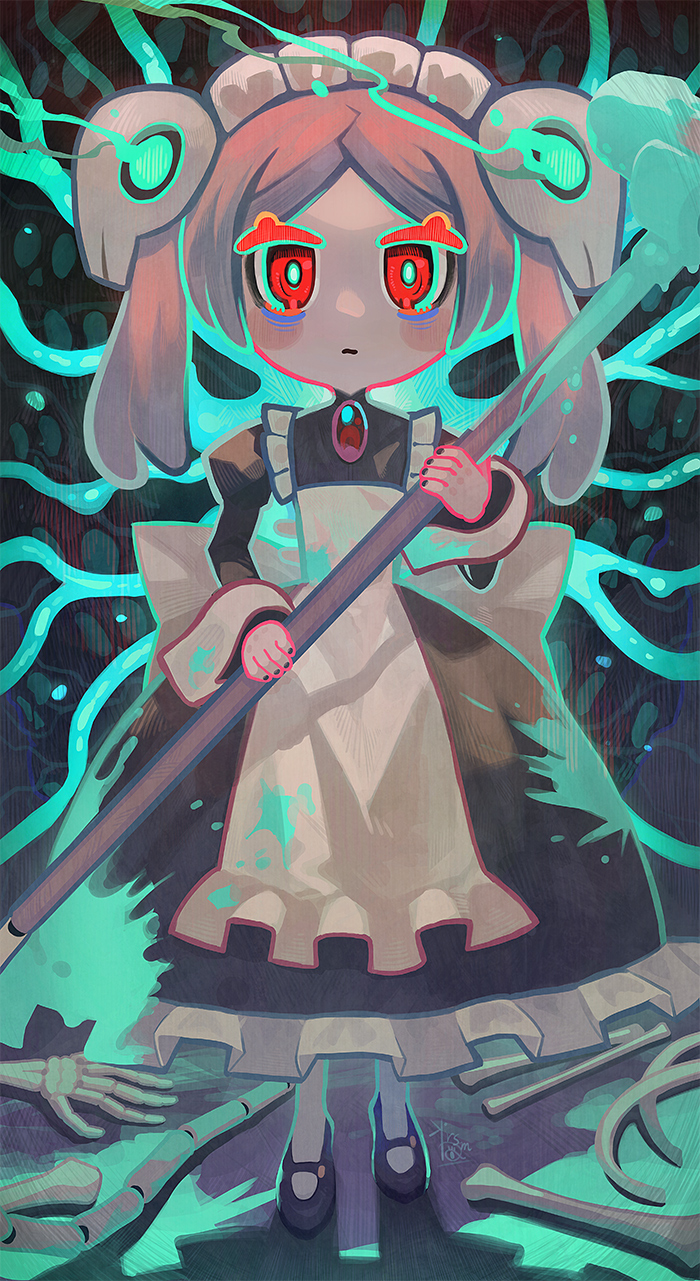 1girl apron black_nails bloody_marie_(skullgirls) brooch dress energy facing_viewer frilled_apron frilled_dress frills grey_hair hair_ornament highres jewelry k_(yy4919) karsm looking_at_viewer maid_apron maid_headdress mary_janes red_eyes shoes skeleton skull_hair_ornament skullgirls solo twintails vacuum_cleaner walking