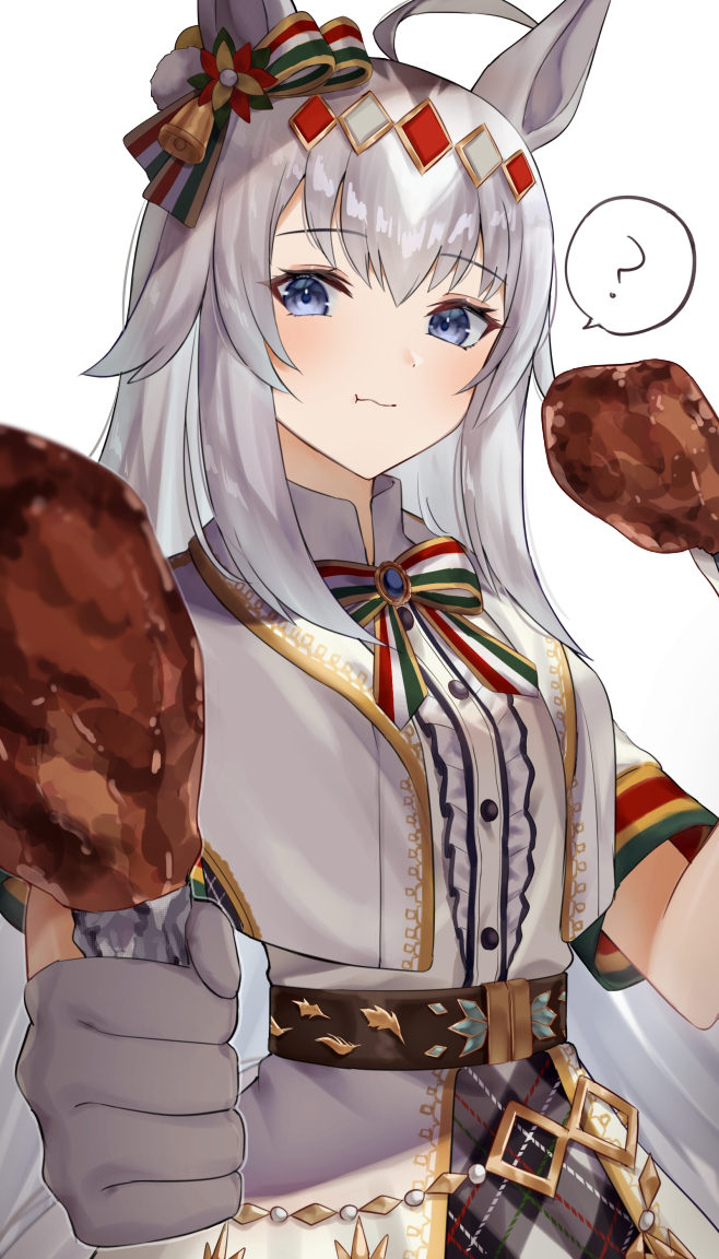 1girl :t ? ahoge animal_ears belt black_belt blue_eyes bow bowtie brooch center_frills chewing commentary cropped_jacket dress eating food foreshortening frills giving gloves green_bow green_bowtie grey_hair hair_ornament high_collar holding holding_food horse_ears horse_girl jacket jewelry long_hair looking_at_viewer multicolored_bow multicolored_bowtie official_alternate_costume oguri_cap_(ashen_miracle)_(umamusume) oguri_cap_(umamusume) red_bow red_bowtie short_sleeves simple_background solo spoken_question_mark turkey_(food) umamusume umamusume:_cinderella_gray white_background white_dress white_gloves white_jacket yoimoriyoru