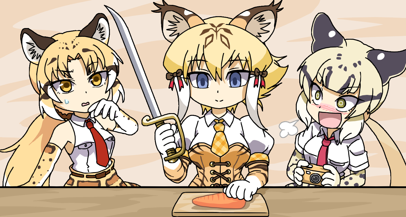 3girls animal_ear_fluff animal_ears arm_at_side bare_shoulders blonde_hair blush bow camera carrot chibi closed_mouth clouded_leopard_(kemono_friends) collared_shirt commentary_request corset cutting_board elbow_gloves empty_eyes excited extra_ears food gloves hair_between_eyes hair_bow hand_up holding holding_camera holding_sword holding_weapon kemono_friends long_hair looking_at_another looking_at_object low_ponytail medium_hair multicolored_hair multiple_girls necktie nervous nose_blush open_mouth plaid_clothes plaid_necktie ponytail puff_of_air puffy_short_sleeves puffy_sleeves raised_eyebrow ringed_eyes saber_(weapon) shirt short_sleeves sleeveless sleeveless_shirt smile smilodon_(kemono_friends) srd_(srdsrd01) sweatdrop sword upper_body vegetable very_long_hair weapon white_hair white_shirt wide-eyed wing_collar yellow_eyes