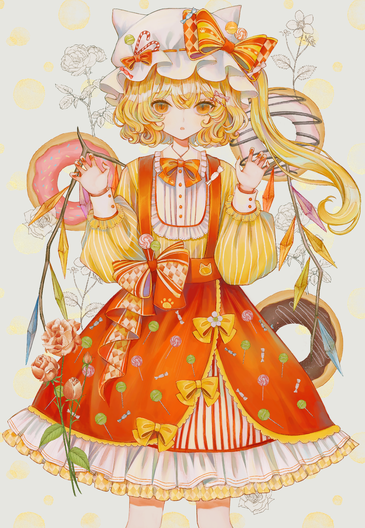 1girl accurate_lolita_coord alternate_costume blonde_hair bow buttons candy claw_pose crystal donut feet_out_of_frame fingernails flandre_scarlet flower food food_print frills hair_between_eyes hat highres hourai_kiriri lolita_fashion lollipop long_fingernails long_hair long_sleeves looking_at_viewer mob_cap nail_polish open_mouth paw_print pink_flower puffy_sleeves red_eyes red_nails red_skirt sharp_fingernails side_ponytail skirt solo striped suspender_skirt suspenders sweet_lolita touhou vertical_stripes white_hat wings