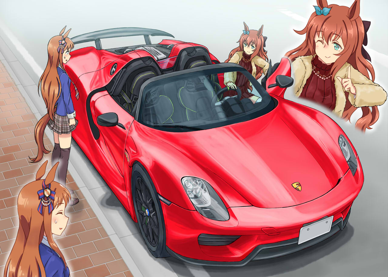 2girls ;) alternate_costume animal_ears black_bow black_thighhighs blazer blue_bow blue_jacket bow brown_coat brown_hair car coat convertible ear_bow from_above grass_wonder_(umamusume) green_eyes hair_bow horse_ears horse_girl horse_tail index_finger_raised jacket jewelry left-hand_drive long_hair looking_at_another maruzensky_(umamusume) motor_vehicle multiple_girls necklace necktie one_eye_closed plaid_clothes plaid_skirt pleated_skirt porsche porsche_918 purple_sweater ribbed_sweater school_uniform skirt smile sweater tail thighhighs ugai_yuichi umamusume vehicle_focus wavy_hair