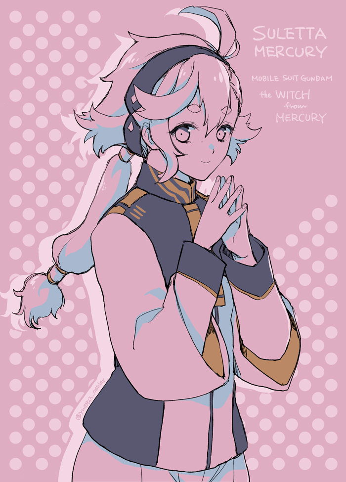 1girl ahoge asticassia_school_uniform black_hairband character_name gundam gundam_suisei_no_majo hair_between_eyes hairband jacket long_sleeves looking_at_viewer low_ponytail multi-tied_hair own_hands_together pink_background pink_theme polka_dot polka_dot_background ponytail school_uniform short_hair_with_long_locks single_sidelock smile solo suletta_mercury takafuji_yuna thick_eyebrows twitter_username upper_body