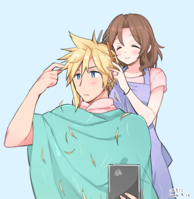 1boy 1girl aerith_gainsborough alternate_costume apron artist_name blonde_hair blue_apron blue_background blue_eyes blush bracelet brown_hair closed_eyes cloud_strife cutting_hair dated final_fantasy final_fantasy_vii hair_between_eyes hand_in_another's_hair hand_in_own_hair jewelry krudears pink_shirt ring shirt short_hair short_sleeves smile spiked_hair upper_body