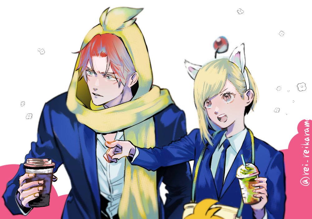 1boy 1girl animal_ear_headwear asymmetrical_hair blonde_hair blue_jacket blue_necktie blue_suit brown_eyes chocobo collared_shirt cup elena_(ff7) facial_mark fake_animal_ears final_fantasy final_fantasy_vii formal_clothes green_eyes holding holding_cup jacket karameruderei moogle necktie open_mouth parted_bangs pointing red_hair reno_(ff7) scarf shirt short_hair suit suit_jacket twitter_username upper_body white_shirt yellow_scarf