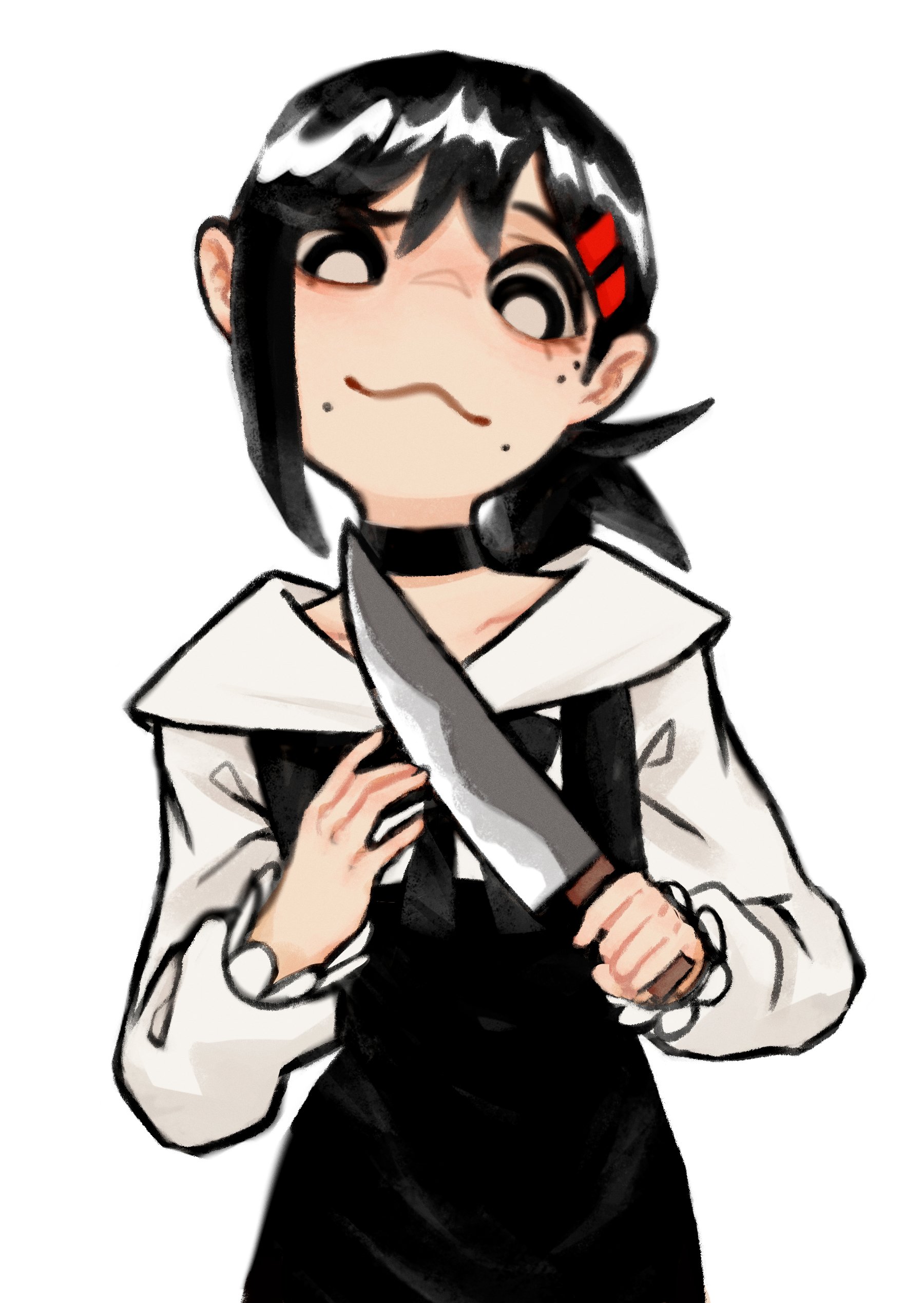 1girl absurdres black_choker black_hair chainsaw_man choker dress gurumo_(twitter) hair_ornament hairclip higashiyama_kobeni highres holding holding_knife kitchen_knife knife looking_at_object looking_down mole mole_under_eye mole_under_mouth pinafore_dress ponytail puffy_sleeves short_ponytail simple_background single_sidelock sleeveless sleeveless_dress solo white_background