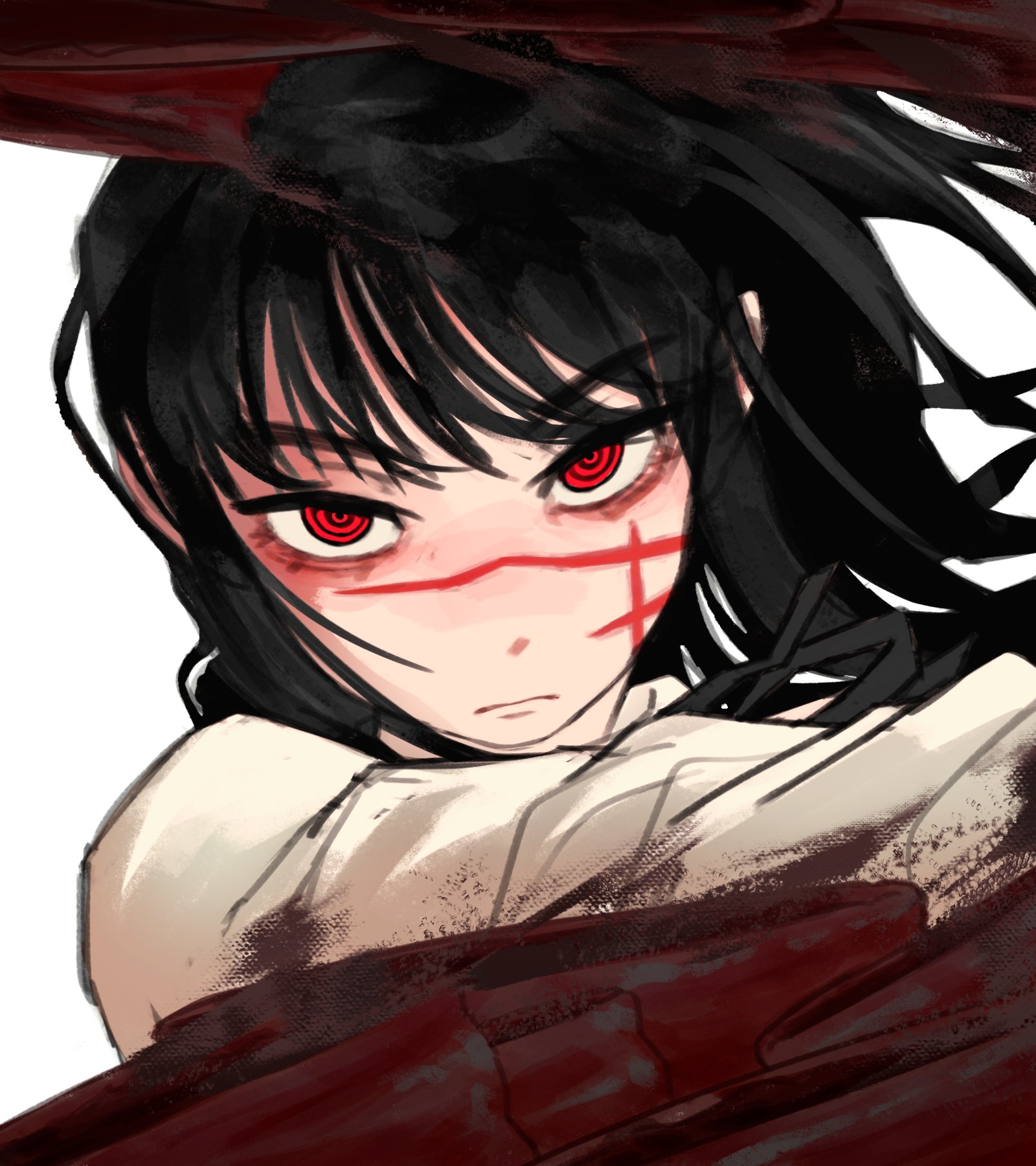 1girl black_hair chainsaw_man cross_scar cutting facial_scar gurumo_(twitter) highres long_hair looking_at_viewer red_eyes ringed_eyes scar scar_on_cheek scar_on_face shirt simple_background solo white_background white_shirt yoru_(chainsaw_man)