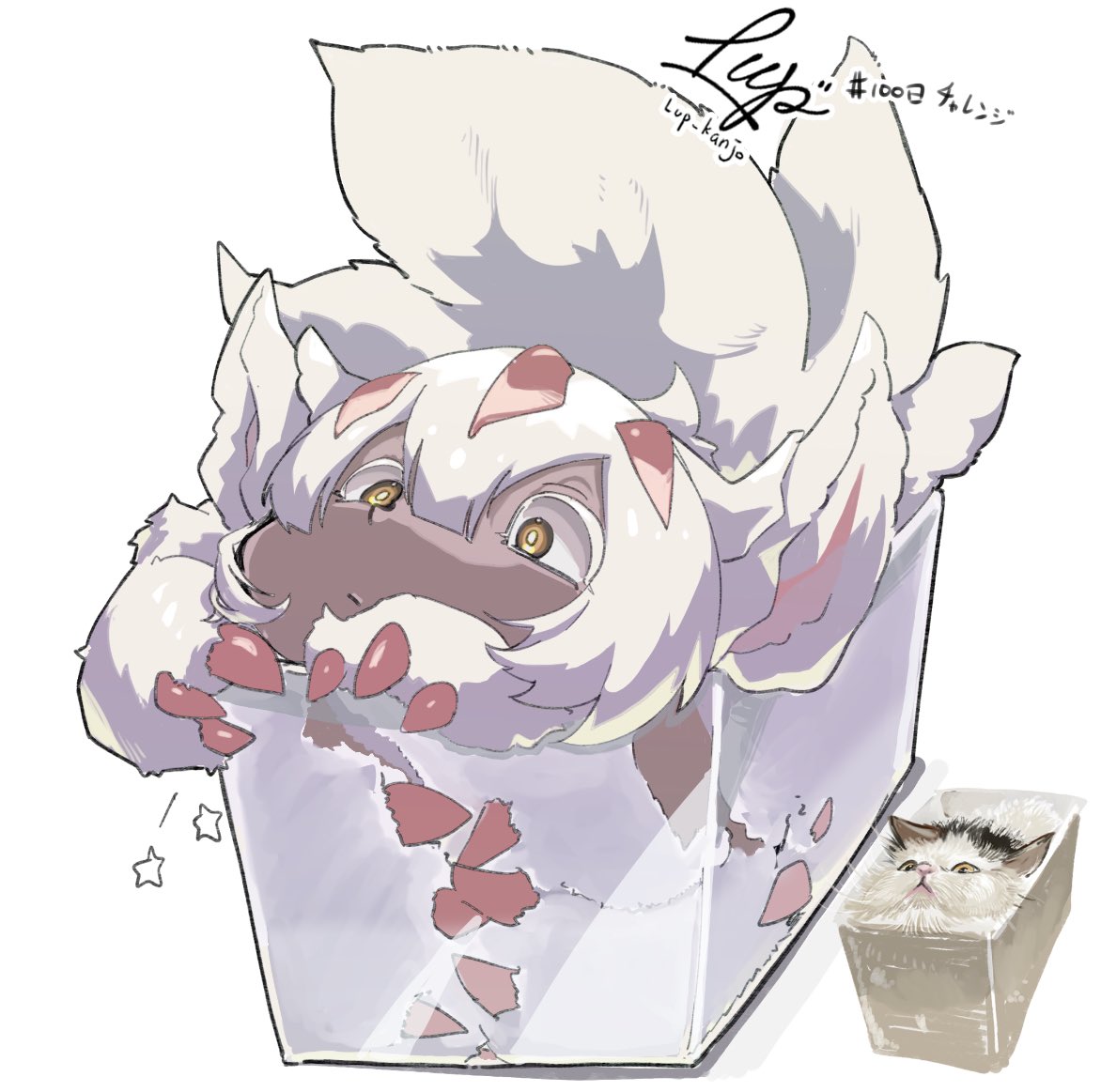 1girl animal animal_ears black_skin brown_eyes cat claws colored_eyelashes colored_skin extra_arms faputa in_container made_in_abyss monster_girl multiple_tails reference_inset signature simple_background star_(symbol) tail umemorika white_background white_fur white_hair