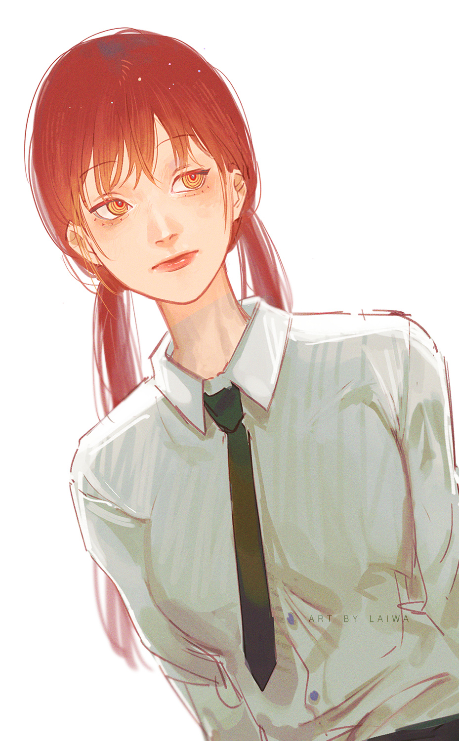 1girl alternate_hairstyle black_necktie chainsaw_man highres laiwa long_hair looking_up makima_(chainsaw_man) necktie red_hair ringed_eyes shirt simple_background solo twintails white_background white_shirt yellow_eyes