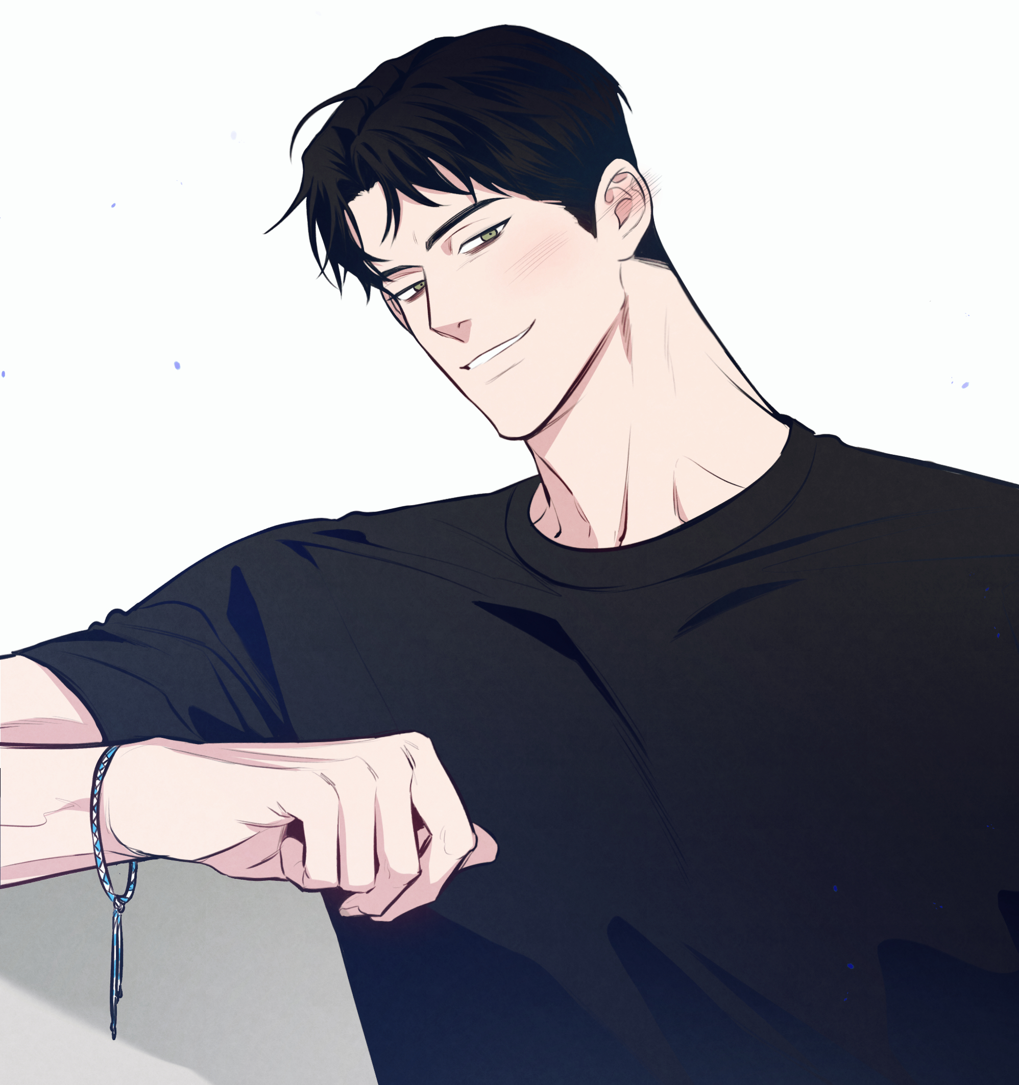black_hair black_shirt blush bracelet byeonbangui ear_blush highres jewelry kang_seo-an looking_at_viewer open_mouth shirt smile the_pizza_delivery_man_and_the_gold_palace white_background yellow_eyes