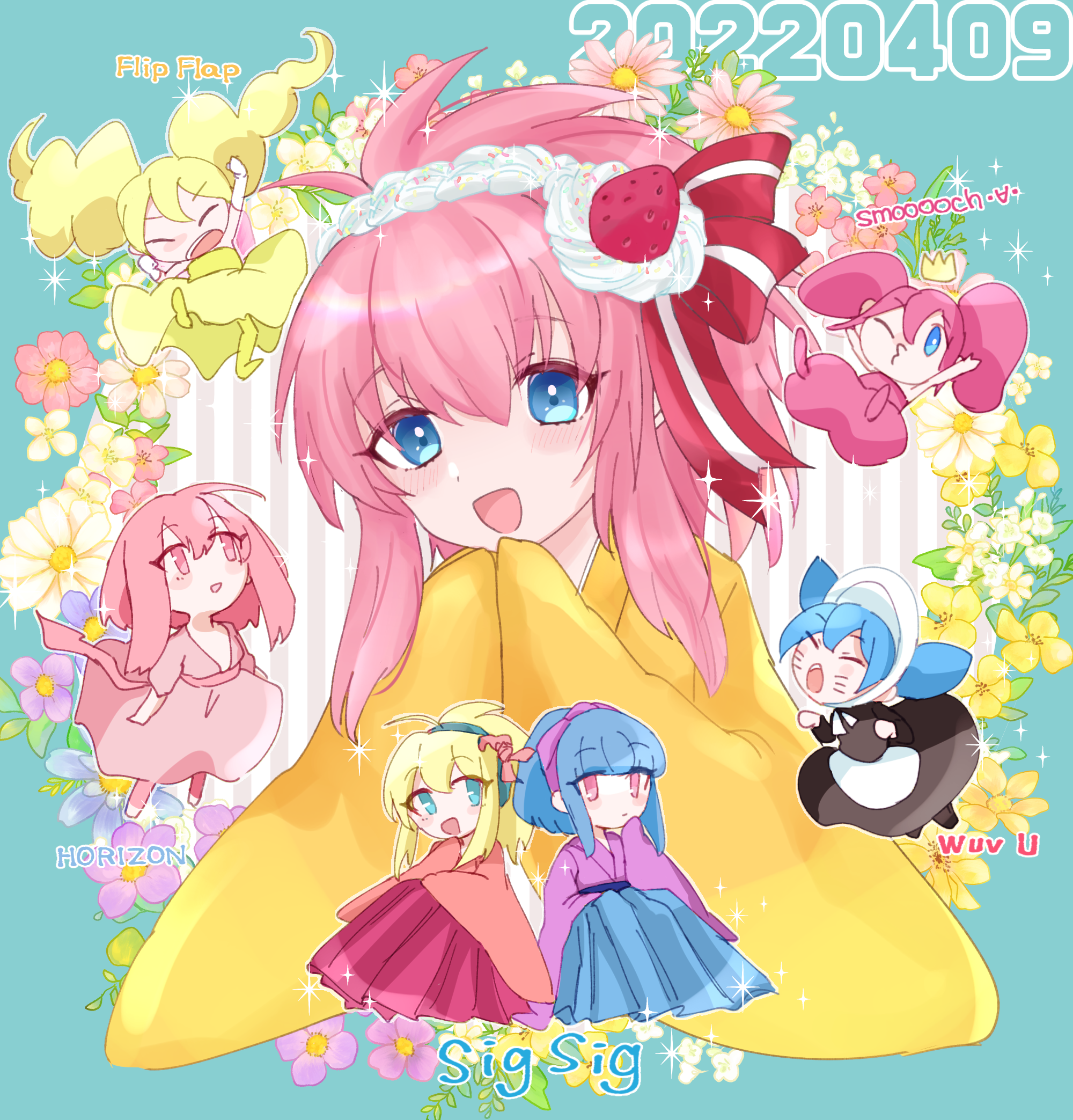 6+girls arm_up beatmania_iidx beatmania_iidx_11_iidx_red beatmania_iidx_12_happy_sky beatmania_iidx_16_empress bemani black_dress blonde_hair blowing_kiss blue_eyes blue_hair blush chibi closed_eyes commentary_request crown double_bun dress facial_mark flip_flap_(bemani) flower hair_between_eyes hair_bun hairband hand_up hands_up highres horizon_(bemani) japanese_clothes kimono long_sleeves mizutamari_(lbsbdpsp) multiple_girls one_eye_closed open_mouth pantyhose pink_dress pink_eyes pink_hair pop'n_music sidelocks sigsig_(bemani) smooooch song_name whisker_markings wide_sleeves wuv_u yellow_dress yellow_pantyhose