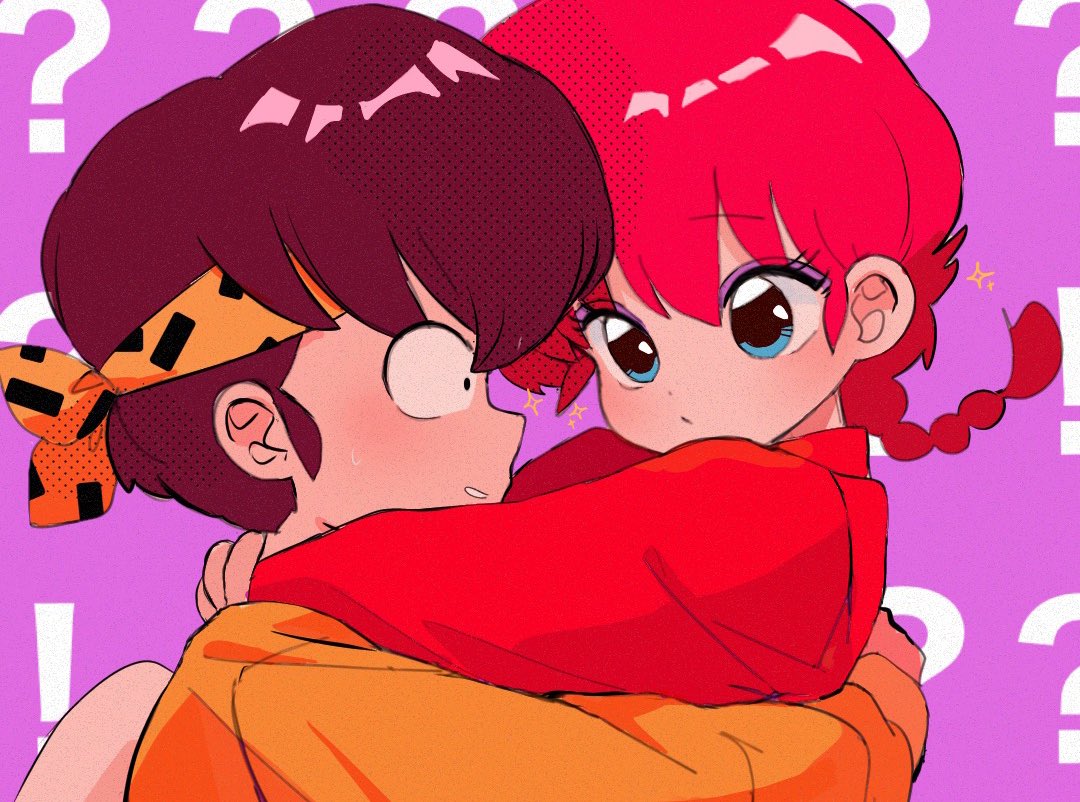 ! 1boy 1girl ? bandana black_hair blue_eyes blush braid braided_ponytail close-up closed_mouth commentary constricted_pupils dot_pupils eye_contact hair_between_eyes halftone headband hibiki_ryouga hug long_hair looking_at_another nervous_smile orange_shirt parted_lips portrait purple_background ranma-chan ranma_1/2 red_hair red_shirt sanamaru_(sana79261827) shirt single_braid smile sparkle yellow_bandana yellow_headband