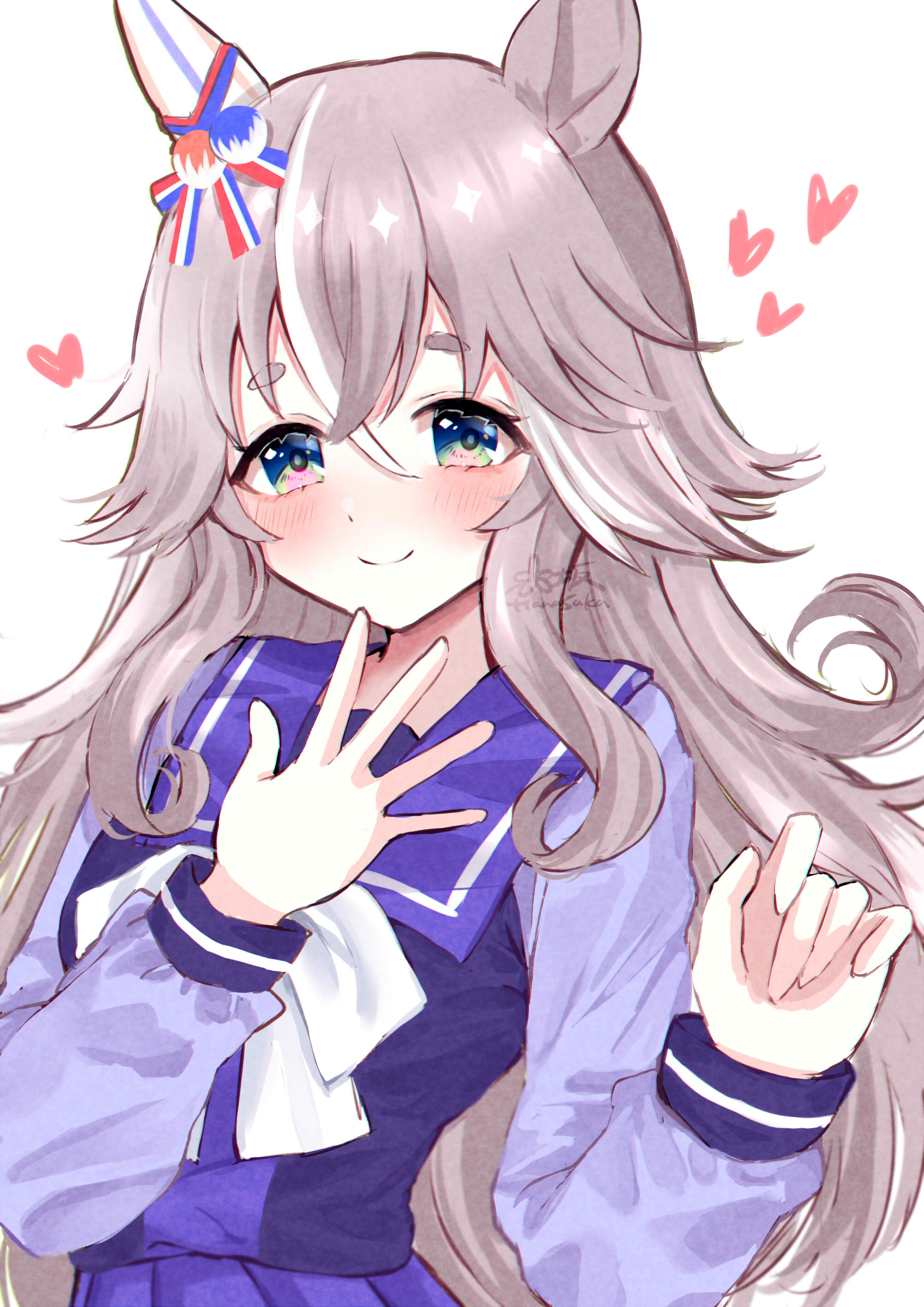 1girl absurdres animal_ears bad_id bad_pixiv_id blush closed_mouth ear_covers grey_hair hair_between_eyes hanasaka_(9769z) highres horse_ears horse_girl long_hair long_sleeves looking_at_viewer portrait school_uniform simple_background single_ear_cover smile solo thick_eyebrows tracen_school_uniform umamusume white_background wonder_acute_(umamusume)