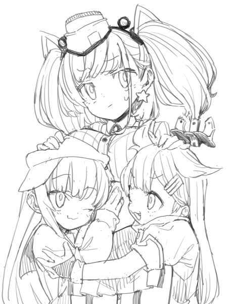 3girls akatsuki_(kancolle) anchor_hair_ornament atlanta_(kancolle) breasts commentary_request dress_shirt earrings fingerless_gloves flat_cap garrison_cap gloves hair_flaps hair_ornament hairclip hand_on_another's_head hat hug jewelry kantai_collection large_breasts long_hair long_sleeves monaka_ooji monochrome multiple_girls one_eye_closed partially_fingerless_gloves scarf school_uniform serafuku shirt star_(symbol) star_earrings two_side_up white_scarf yuudachi_(kancolle)