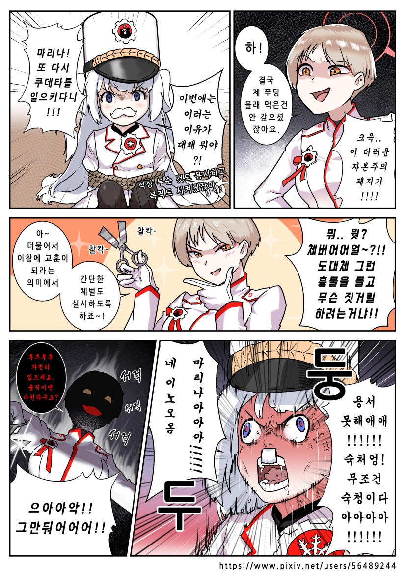 2girls 5koma angry blue_archive cherino_(blue_archive) comic korean_text kyoungku marina_(blue_archive) multiple_girls rope scissors