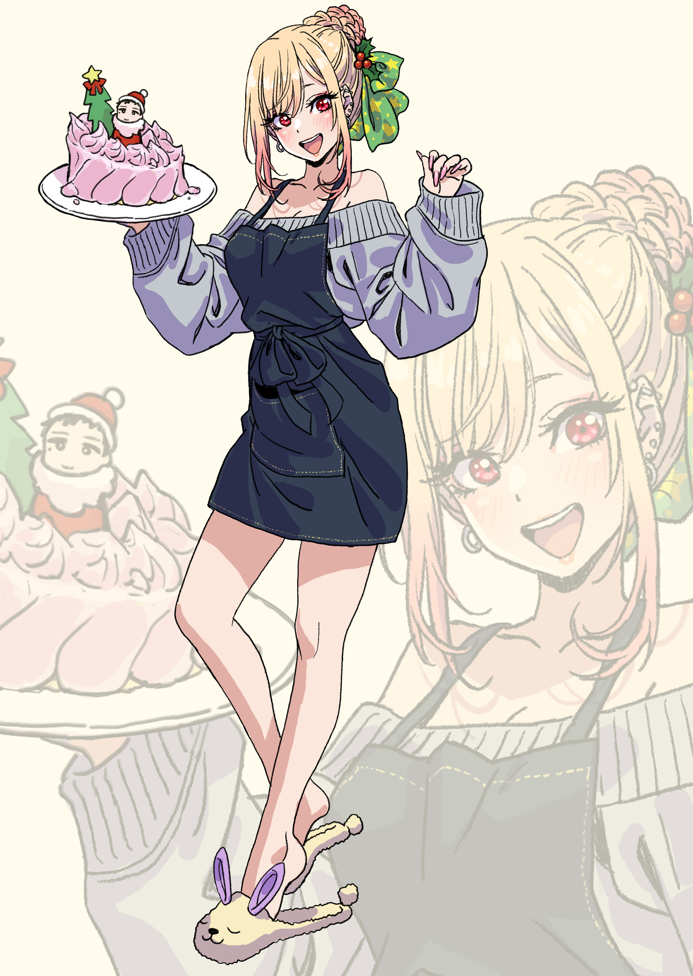 1girl absurdres animal_slippers apron bare_shoulders barefoot blonde_hair blush bow braid braided_bun bunny_slippers cake christmas_ornaments christmas_tree ear_piercing fake_nails food gojou_wakana hair_bow hair_bun hat highres kitagawa_marin looking_at_viewer off-shoulder_sweater off_shoulder piercing pink_nails plate red_eyes santa_costume santa_hat slippers solo sono_bisque_doll_wa_koi_wo_suru sweater swept_bangs yamashita_shun'ya