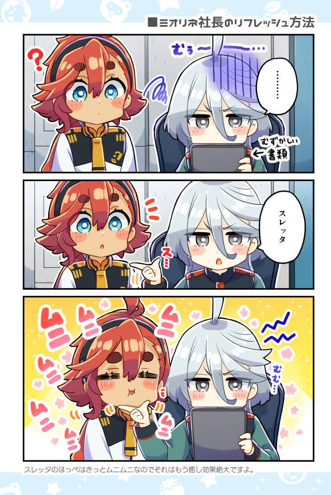 ... 2girls ? ahoge asticassia_school_uniform black_hairband blue_eyes blush chair character_name chibi closed_eyes comic furrowed_brow green_jacket grey_eyes grey_hair gundam gundam_suisei_no_majo hair_between_eyes hairband hand_on_another's_chin indoors jacket long_hair long_sleeves low_ponytail miorine_rembran multiple_girls namu76 necktie parted_lips ponytail red_hair school_uniform short_hair_with_long_locks single_sidelock sitting speech_bubble squiggle suletta_mercury thick_eyebrows translated white_jacket yellow_necktie yuri