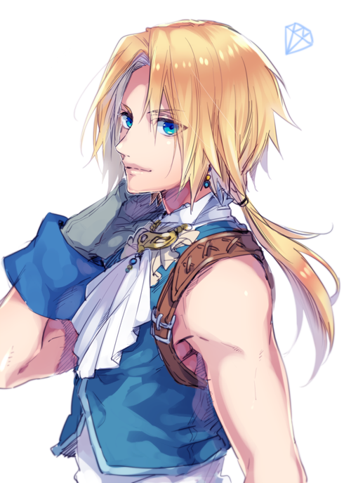 1boy ascot bare_shoulders blonde_hair blue_eyes blue_vest cropped_vest earrings final_fantasy final_fantasy_ix gloves grey_gloves hand_in_own_hair jewelry looking_at_viewer low_ponytail male_focus nakagawa_waka parted_bangs ponytail portrait shirt short_hair_with_long_locks sleeveless sleeveless_shirt solo toned toned_male upper_body vest white_ascot white_background white_shirt wrist_cuffs zidane_tribal
