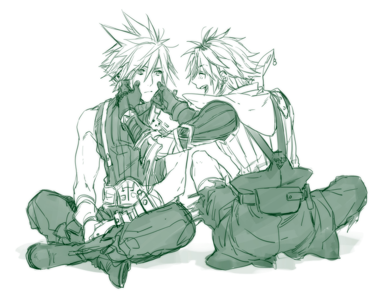 2boys armor belt boots cheek_pinching closed_eyes closed_mouth cloud_strife dissidia_final_fantasy final_fantasy final_fantasy_vii final_fantasy_x full_body gloves hair_between_eyes hood hood_down hooded_jacket in-franchise_crossover indian_style jacket looking_at_another male_focus monochrome multiple_boys nakagawa_waka open_mouth overalls pants pinching short_hair shoulder_armor single_bare_shoulder sitting sleeveless sleeveless_turtleneck smile spiked_hair square_enix suspenders tidus toned toned_male turtleneck white_background