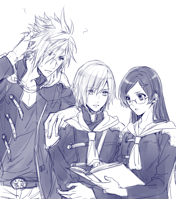 1girl 2boys ? ace_(fft-0) armor belt belt_buckle book breasts buckle cape crossed_arms final_fantasy final_fantasy_type-0 glasses hair_between_eyes hair_ornament hairclip hand_on_another's_shoulder holding holding_book jacket long_hair long_sleeves medium_breasts monochrome multiple_boys nakagawa_waka nine_(fft-0) open_mouth queen_(fft-0) reading scar scar_on_face scar_on_nose school_uniform scratching_head shirt short_hair shoulder_armor spiked_hair sweatdrop swept_bangs upper_body white_background