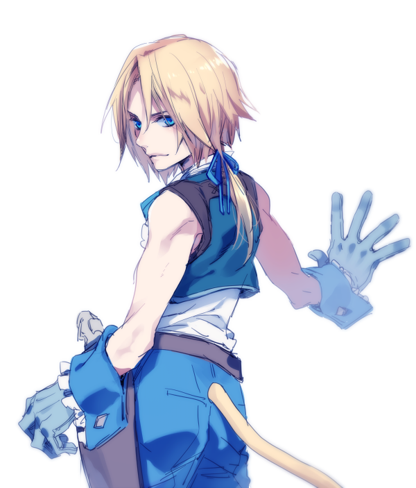 1boy bare_shoulders belt blonde_hair blue_eyes blue_pants blue_ribbon blue_vest closed_mouth cowboy_shot cropped_vest facing_away final_fantasy final_fantasy_ix gloves grey_gloves hair_ribbon looking_at_viewer looking_back low_ponytail male_focus monkey_tail nakagawa_waka pants parted_bangs ponytail ribbon shirt short_hair_with_long_locks sleeveless sleeveless_shirt solo tail vest white_background white_shirt wrist_cuffs zidane_tribal