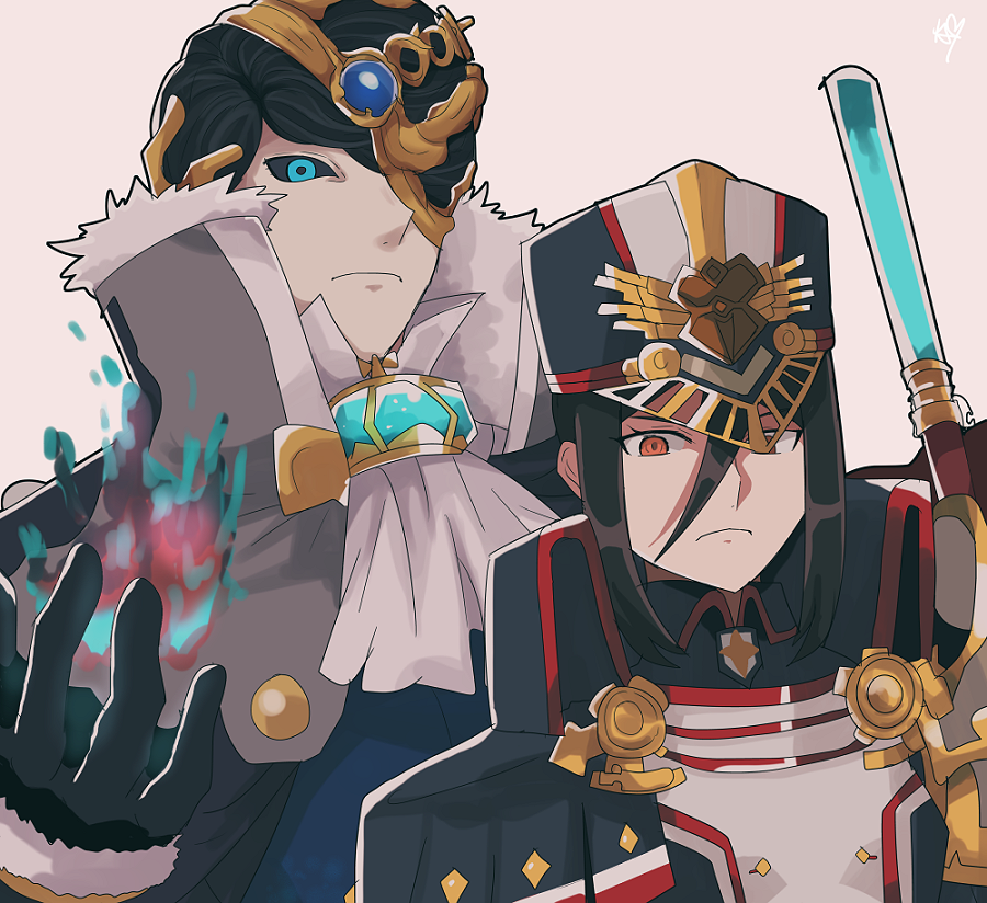 1boy 1girl black_coat black_gloves black_hair black_sclera blue_eyes brown_hair closed_mouth coat colored_sclera dagas_(xenoblade) gloves grey_background hat long_sleeves looking_at_viewer military military_hat military_uniform morag_ladair_(xenoblade) rem_(eyes_410) simple_background upper_body xenoblade_chronicles_(series) xenoblade_chronicles_2