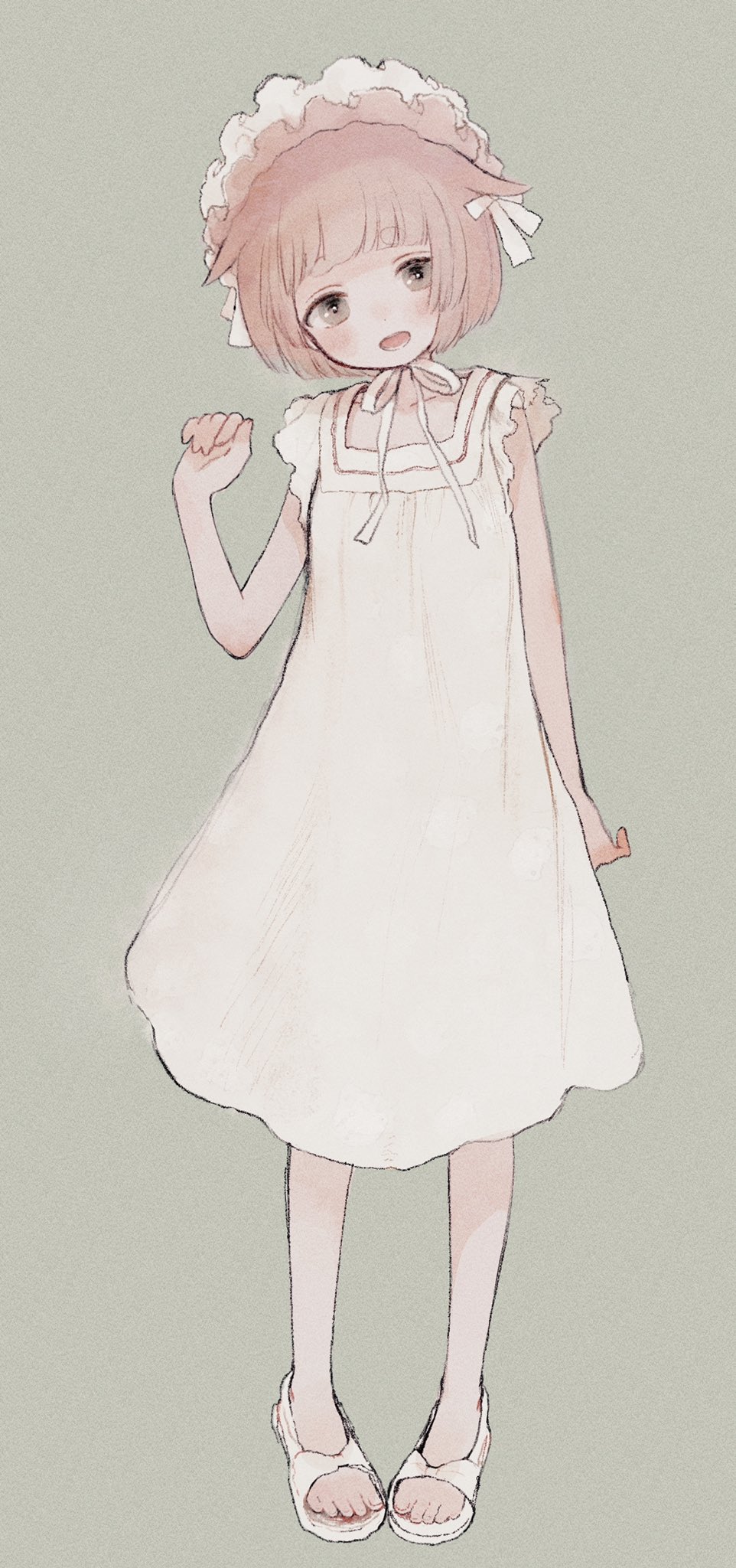 1girl blush brown_hair character_request commentary_request dress full_body grey_background grey_eyes hair_flaps headdress highres looking_at_viewer musou_no_machi no_socks open_mouth ribbon sandals short_eyebrows short_hair simple_background smile solo toes white_dress white_headdress white_ribbon yorunogumo